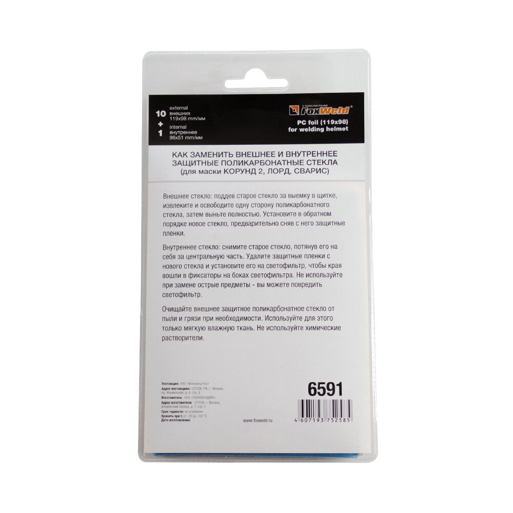 FoxWeld Комплект поликарбонатных стекол №2 (10 внешних 119х98мм, 1 внутреннее 96х51мм, для масок Корунд-2/cварис/Лорд) информация:
