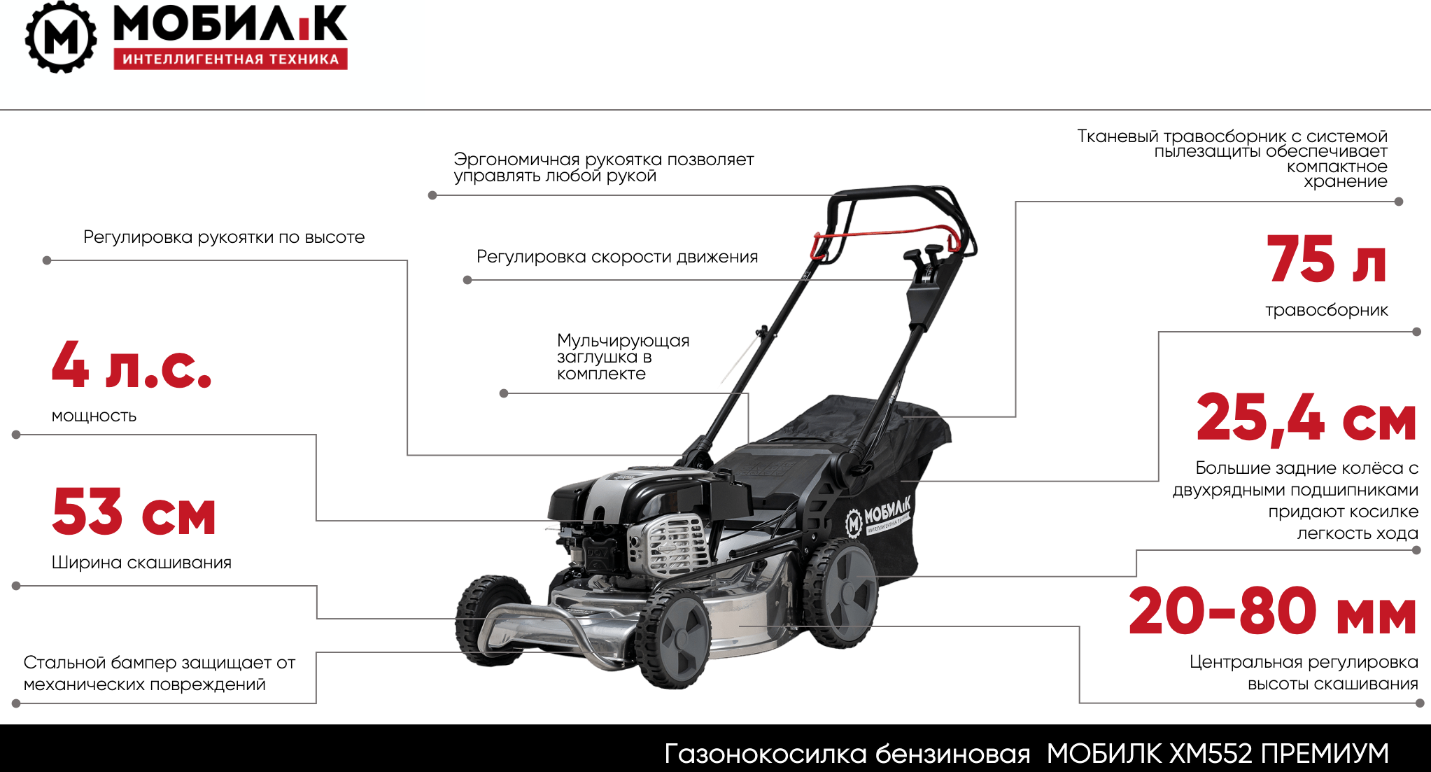 Газонокосилка бензиновая мобил К XM552 премиум с двигателем Briggs&Stratton 750PXi информация: