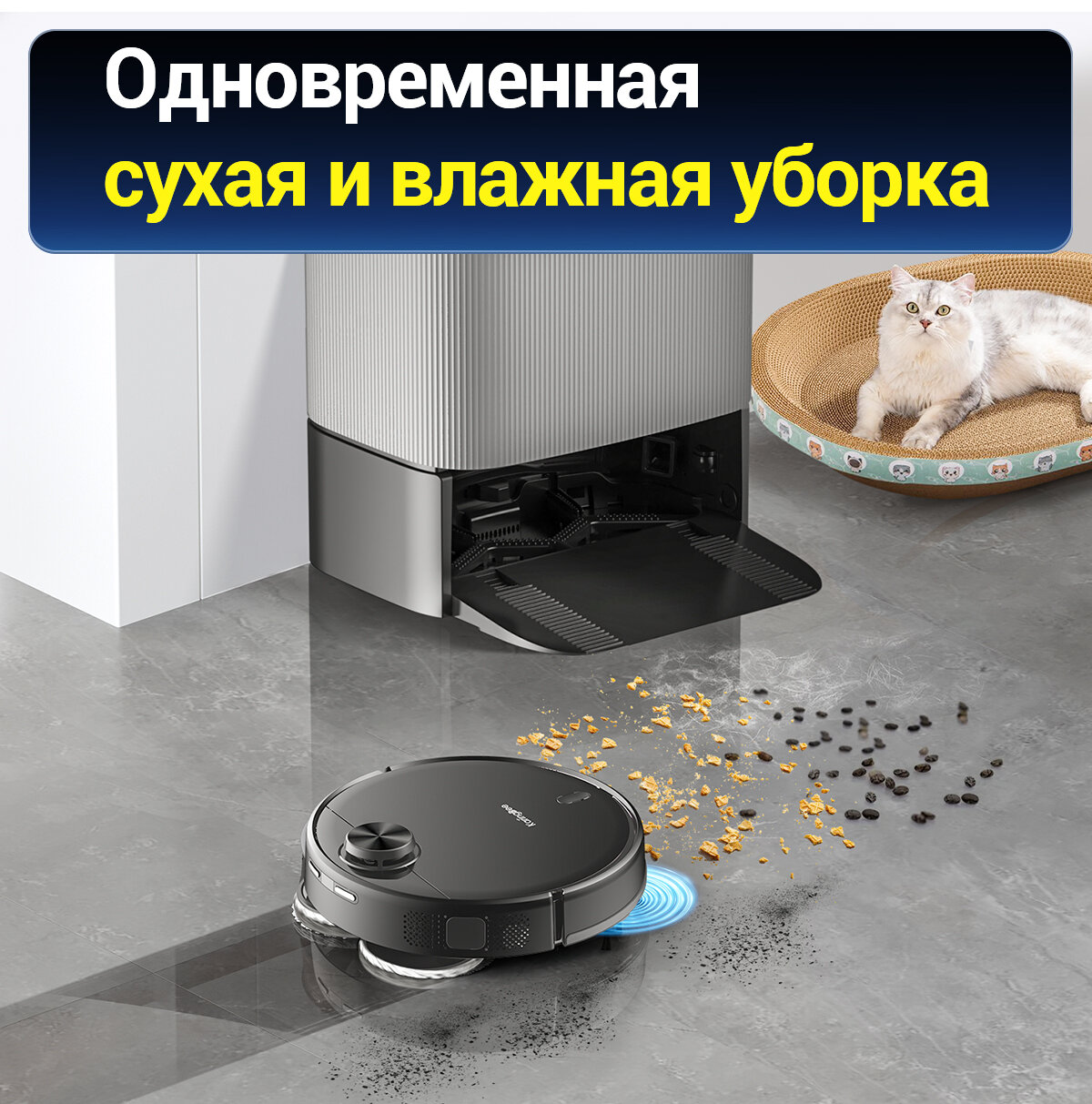 | Особенности конструкции | датчик TOF / датчик перепада высоты / дисплей / индикатор заполнения пылесборника / лидар / мусоросборник в базе / мягкий бампер |