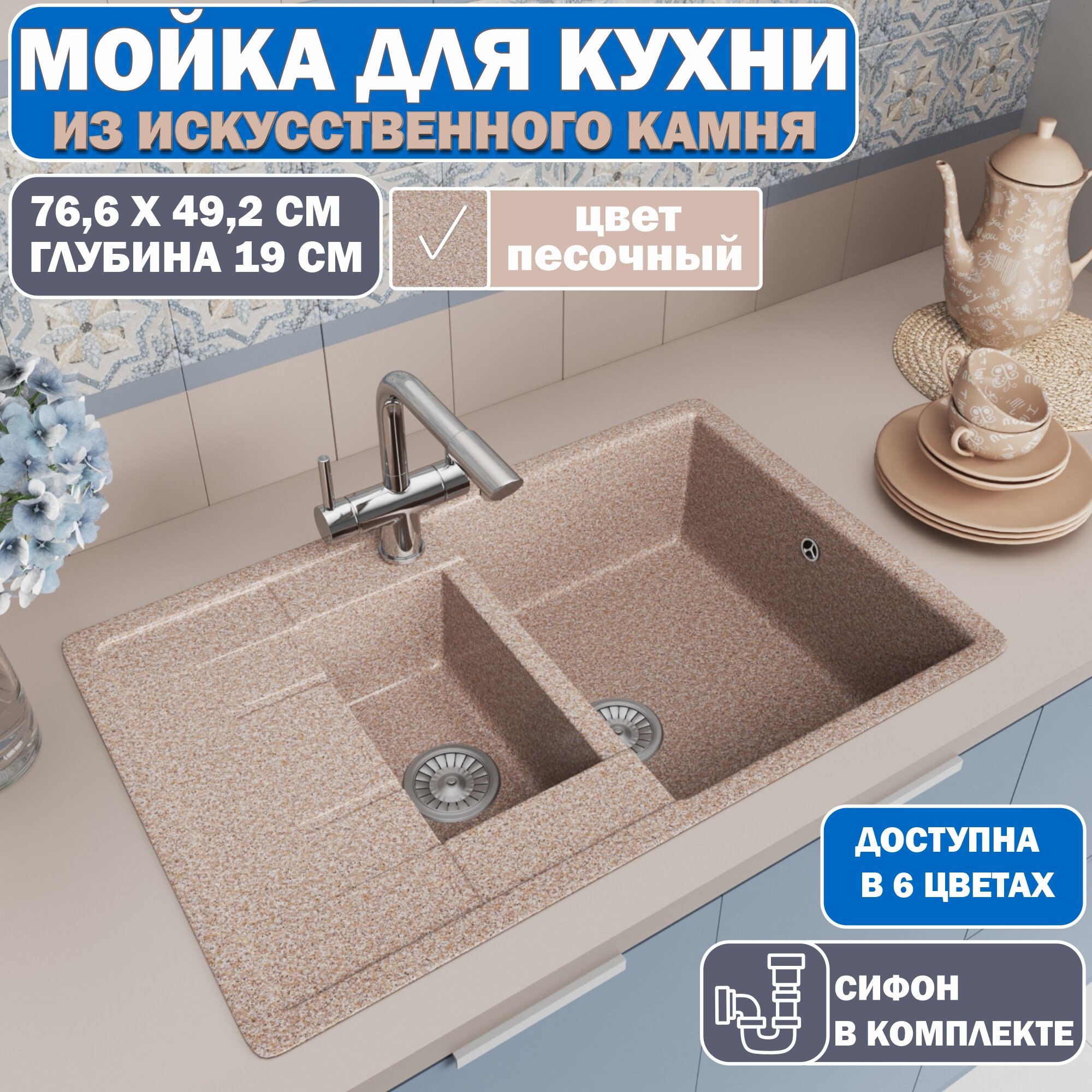 Мойка для кухни из искусственного камня двойная (76,6x49,2), песочная информация: