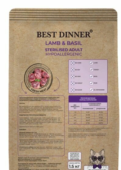 Полнорационный сухой корм Best Dinner Holistic Hypoallergenic Adult Sterilised для стерилизованных кошек с ягненком и базиликом 10 кг информация: