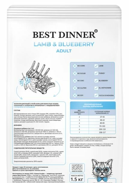 Отзывы на Полнорационный сухой корм Best Dinner Adult для кошек с ягненком и голубикой 10 кг