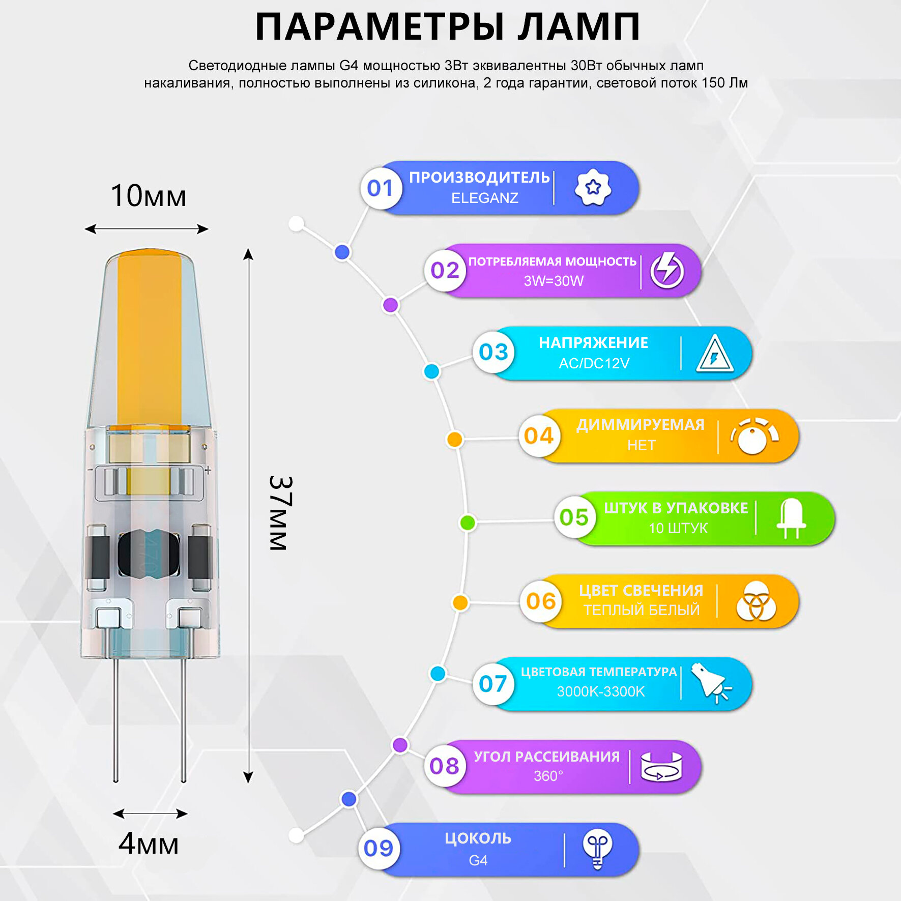 10 цен на Комплект светодиодных ламп Eleganz G4, 12В, 3Вт, 3000K, 10штук