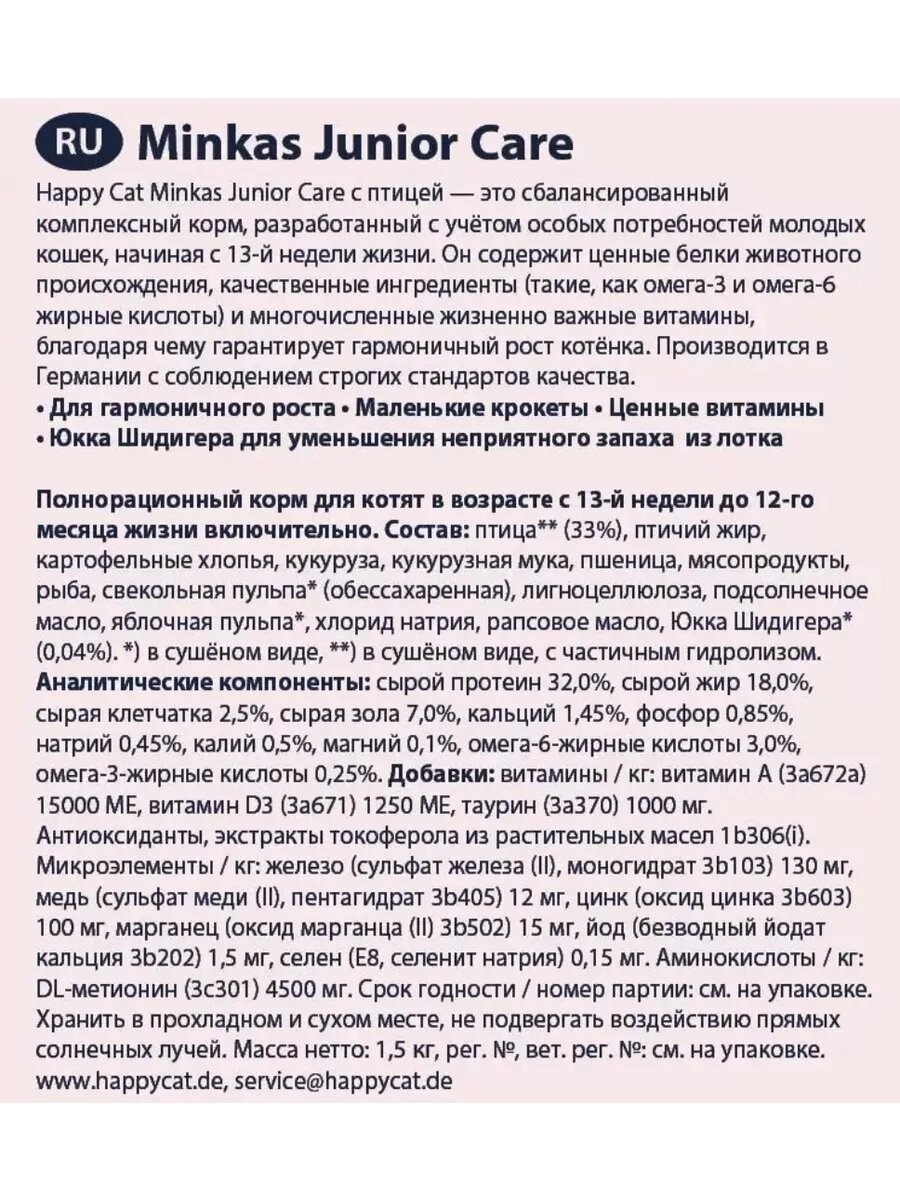Сухой корм Minkas Junior Care для котят с 4 месяцев 1,5 кг информация:
