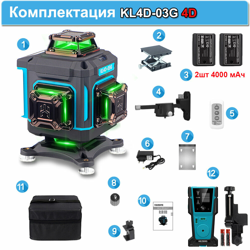 Лазерный уровень Kezers KL4D-03G, Зеленый луч 360 4D 16 Линий, С 2-мя литиевыми батареями емкостью 4000 мАч Чемодан, С приемником KL-1D 12 999 ₽