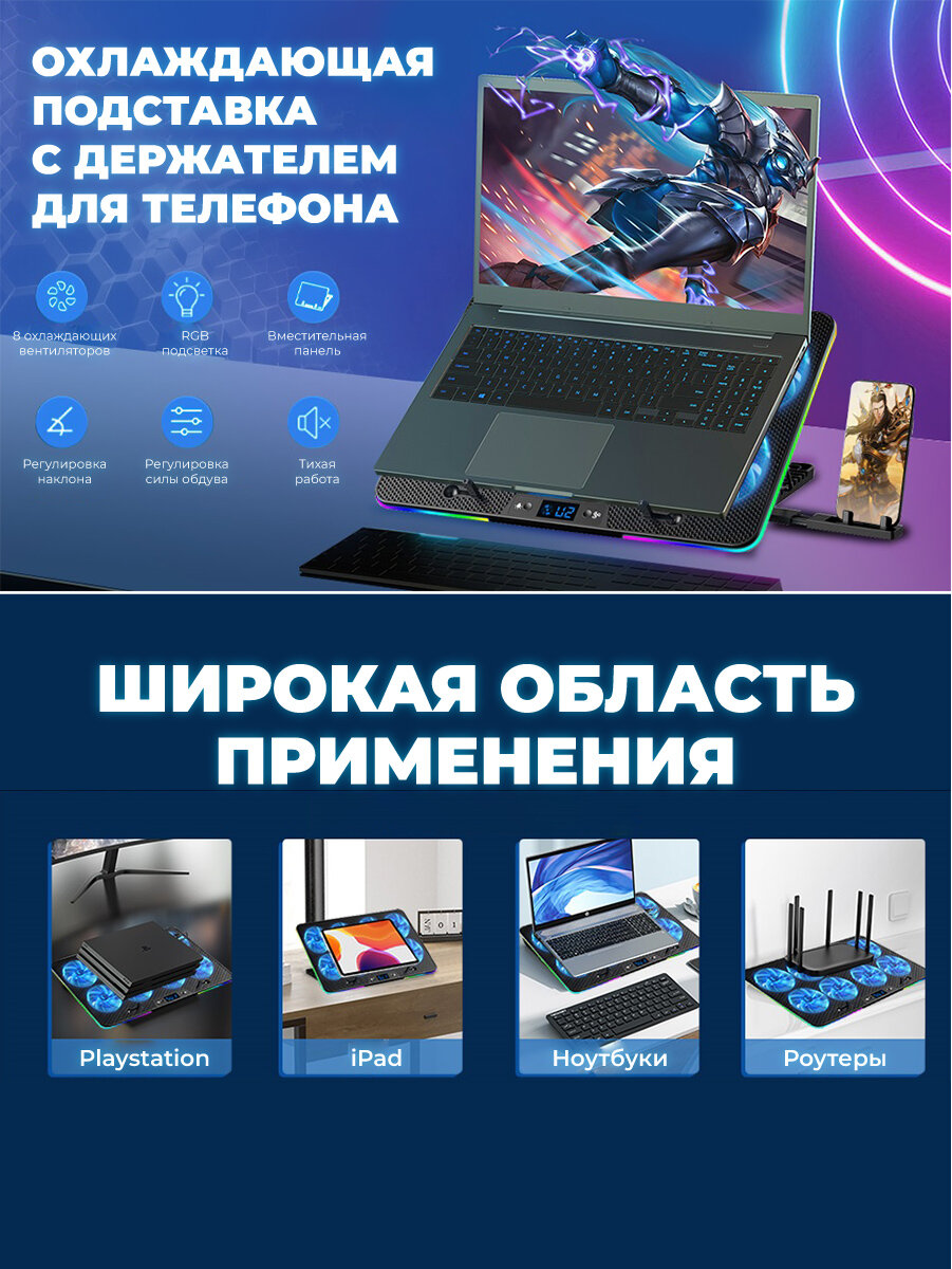 Отзывы на Охлаждающая подставка для ноутбука до 17", 8 вентиляторов, подставка для смартфона, RGB