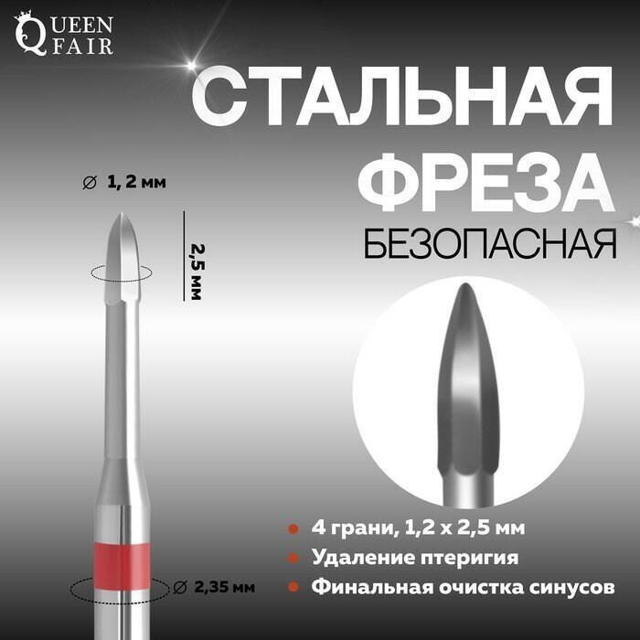 Queen fair Фреза для маникюра, безопасная, 4 грани, 1,2 × 2,5 мм, в пластиковом футляре