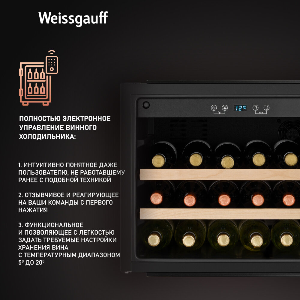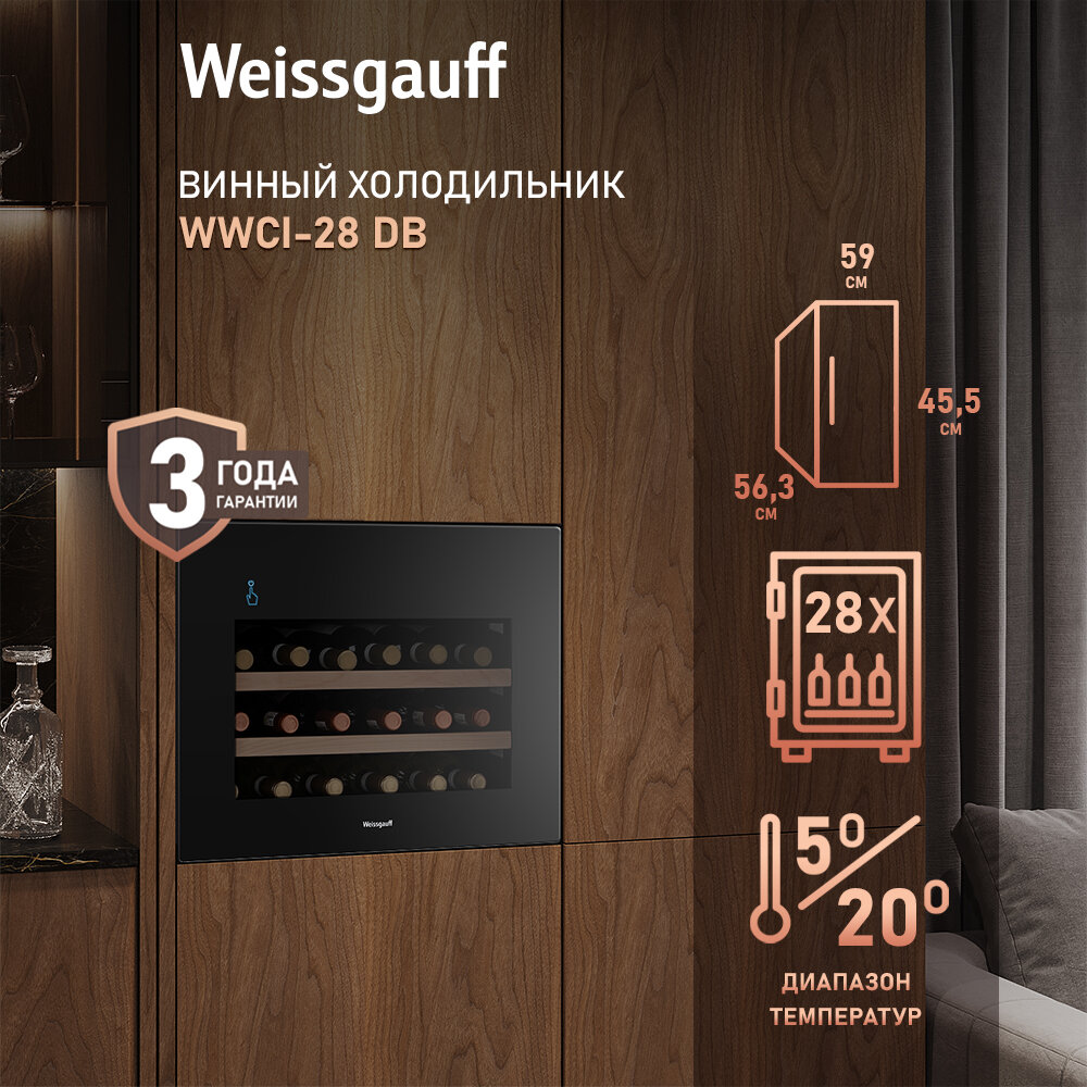 Встраиваемый винный холодильник Weissgauff WWCI-28 DB компрессорный холодильник для вина, 28 бутылок, 3 года гарантии информация: