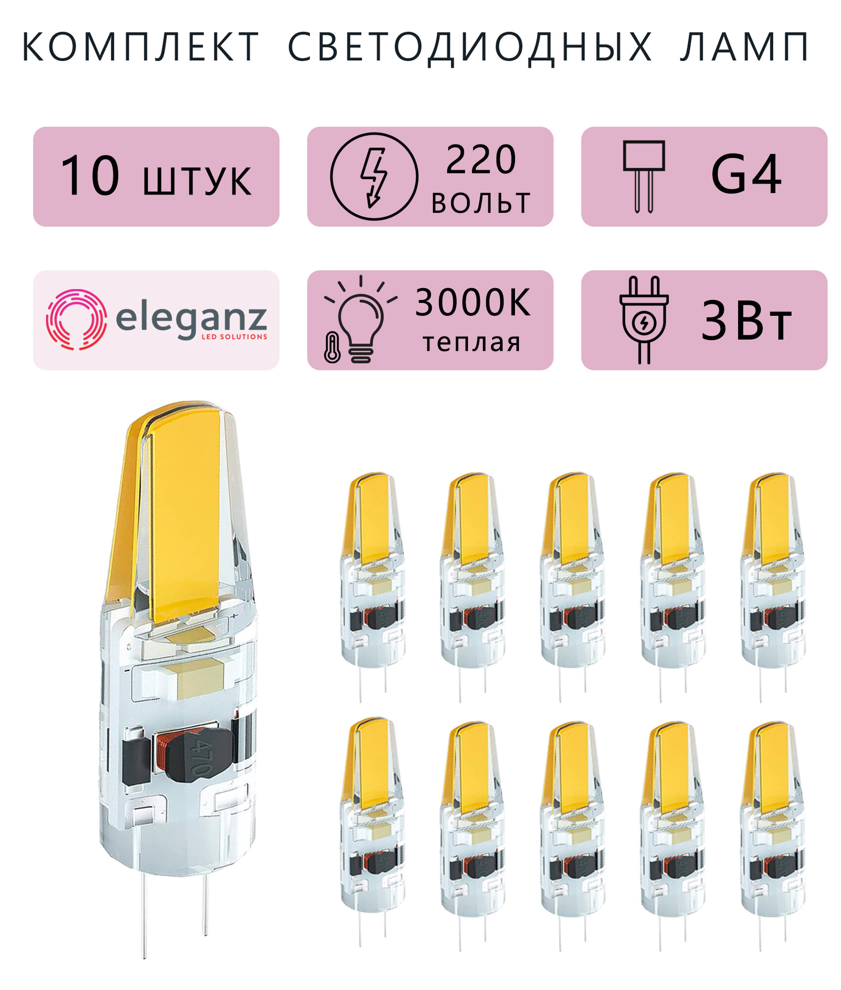 Комплект светодиодных ламп Eleganz, G4, 220В, 3Вт, 3000K, 10штук информация: