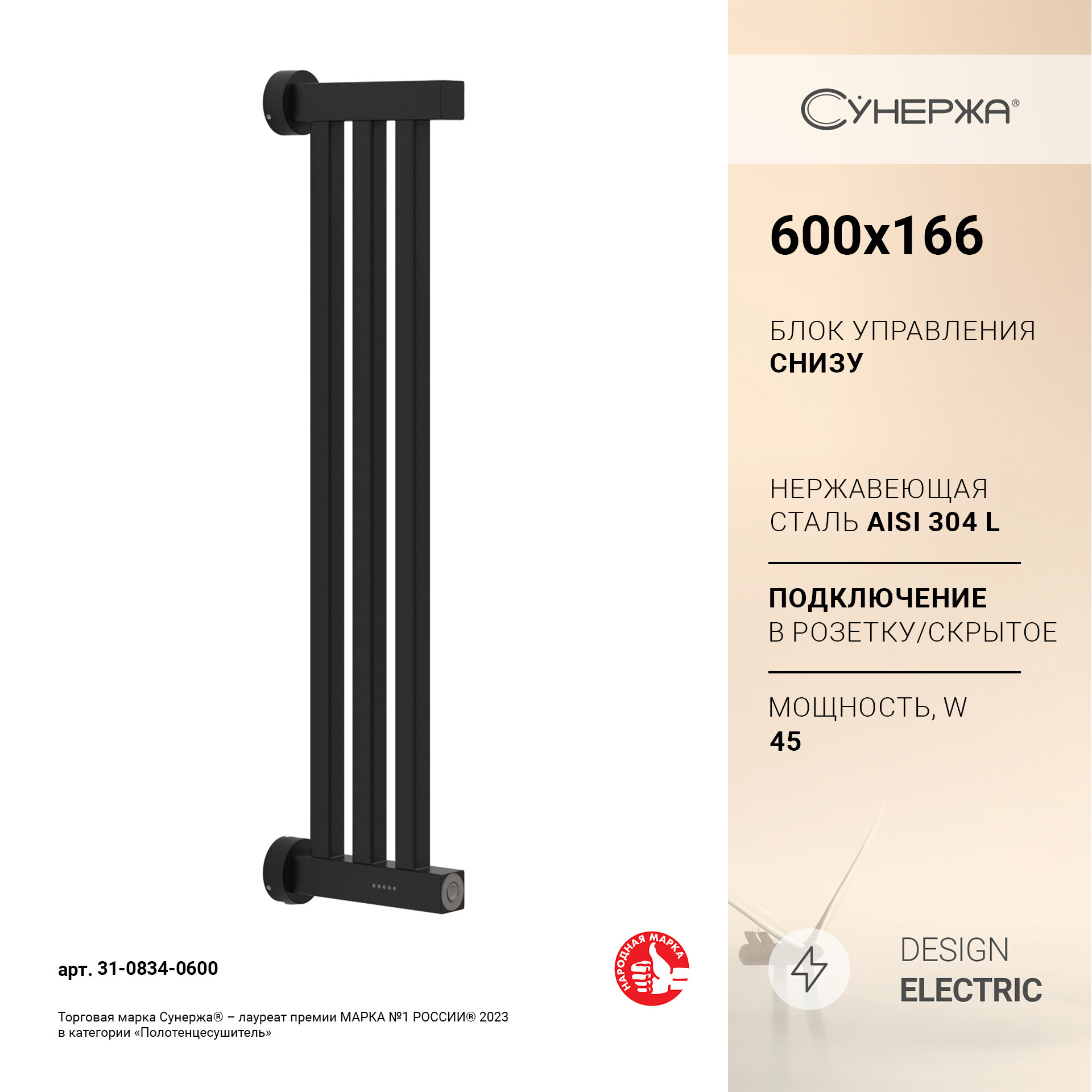 Полотенцесушитель электрический Сунержа Хорда 4.0 600х166 Матовый чёрный информация: