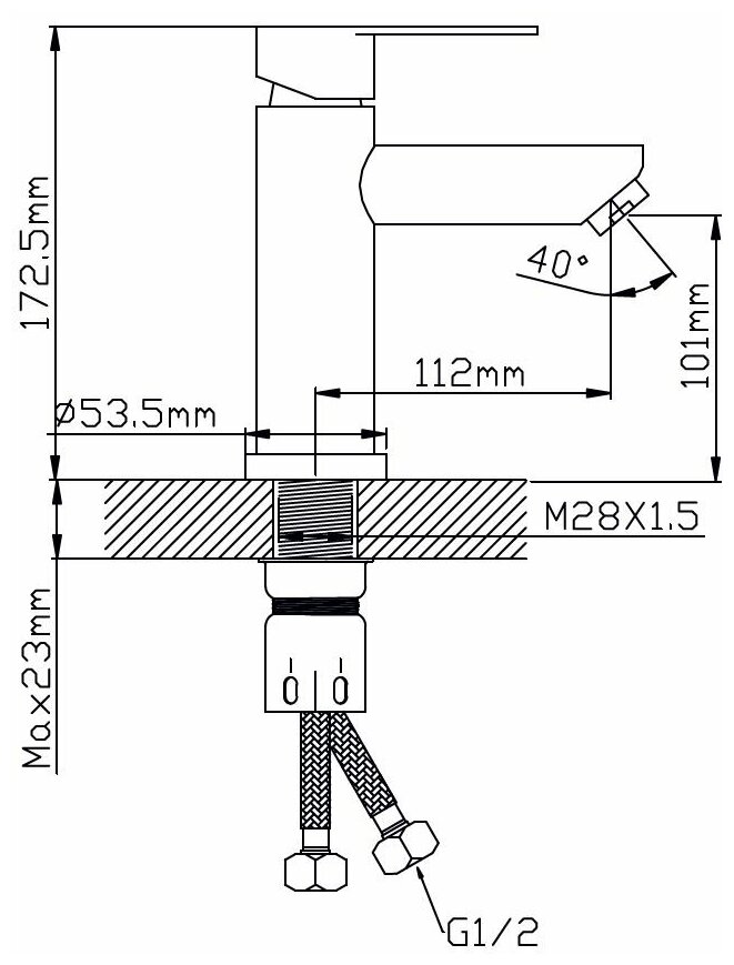 | Комплектация | смеситель, крепёж на гайке, две гибкие подводки 1/2" длиной 35 см, паспорт изделия |