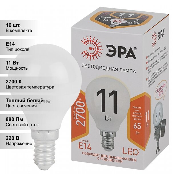 (16 шт.) Светодиодная лампочка ЭРА P45 11Вт 170-265В 2700К Е14 информация: