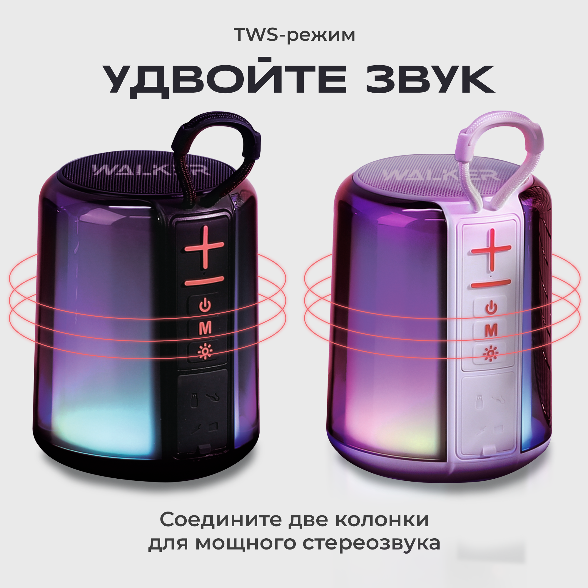 Портативная колонка, WALKER, WSP-125, 5Вт, RGB-подсветка, TWS, Bluetooth 5.3, колонка блютуз, колонка jbl, jbl колонка, bluetooth колонка, фиолетовая 1 529 ₽
