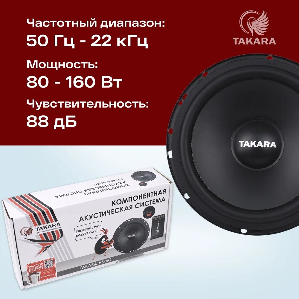 Динамики Takara AS-6C, диаметр 6.5" дюймов, мощность 160 Вт, частотный диапазон 50-22 kHz, 2 шт информация: