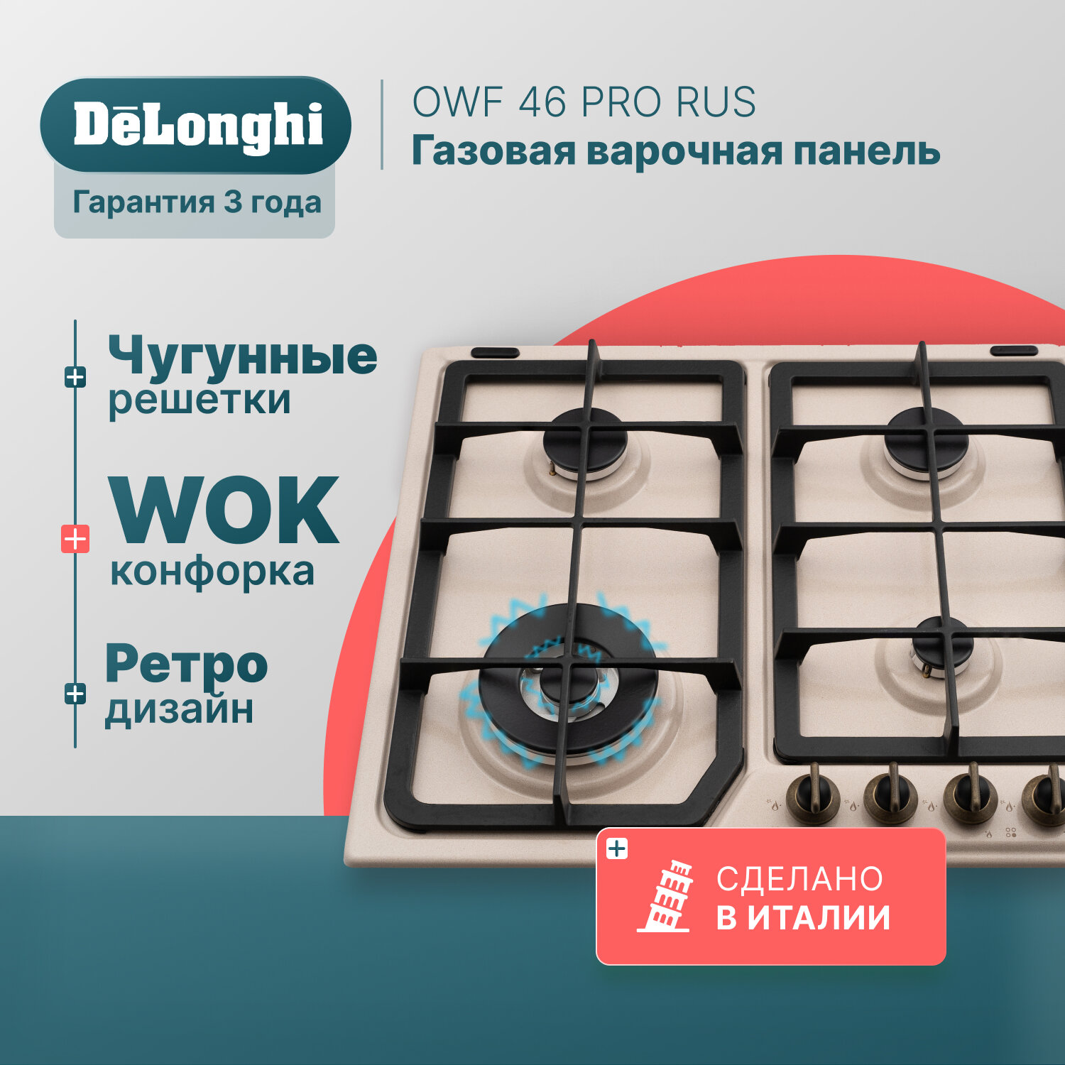 Встраиваемая независимая газовая поверхность DeLonghi OWF 46 PRO RUS информация: