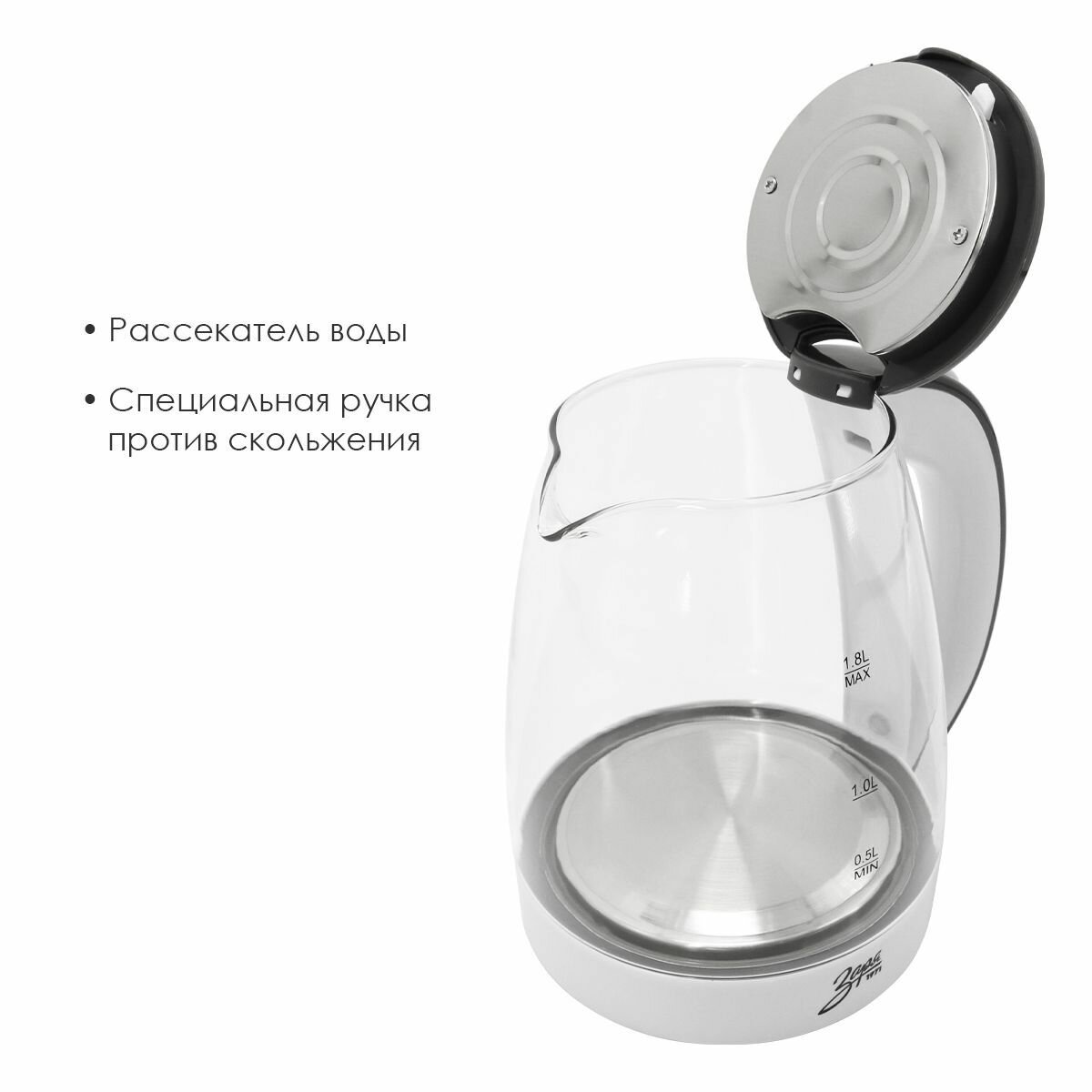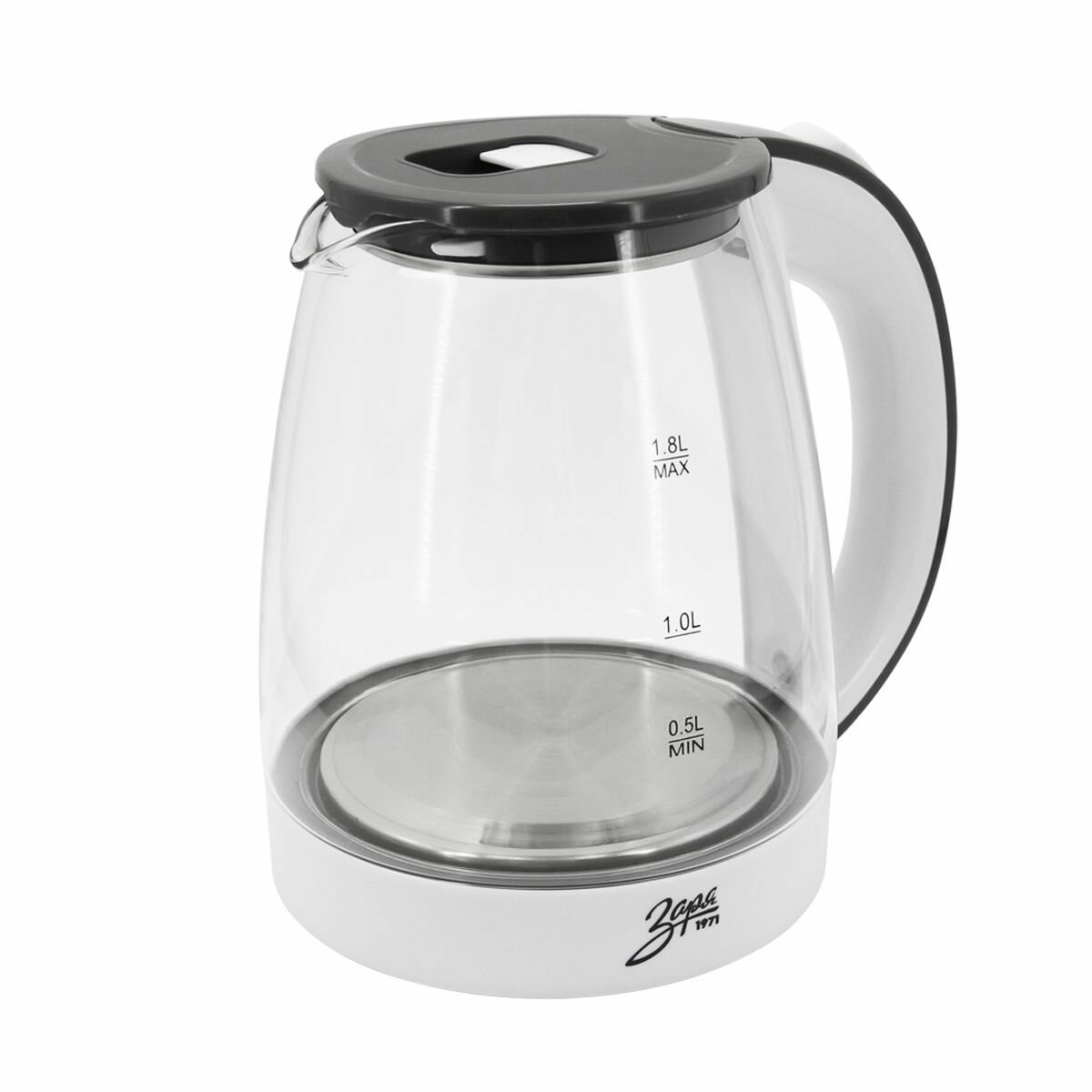 Электрический чайник Заря 258-05 1.8 л / стеклянный / с подсветкой / дисковый ТЭН / автоотключение / поворот на 360 / пластиковый / электрочайник / 1500 Вт / белый информация: