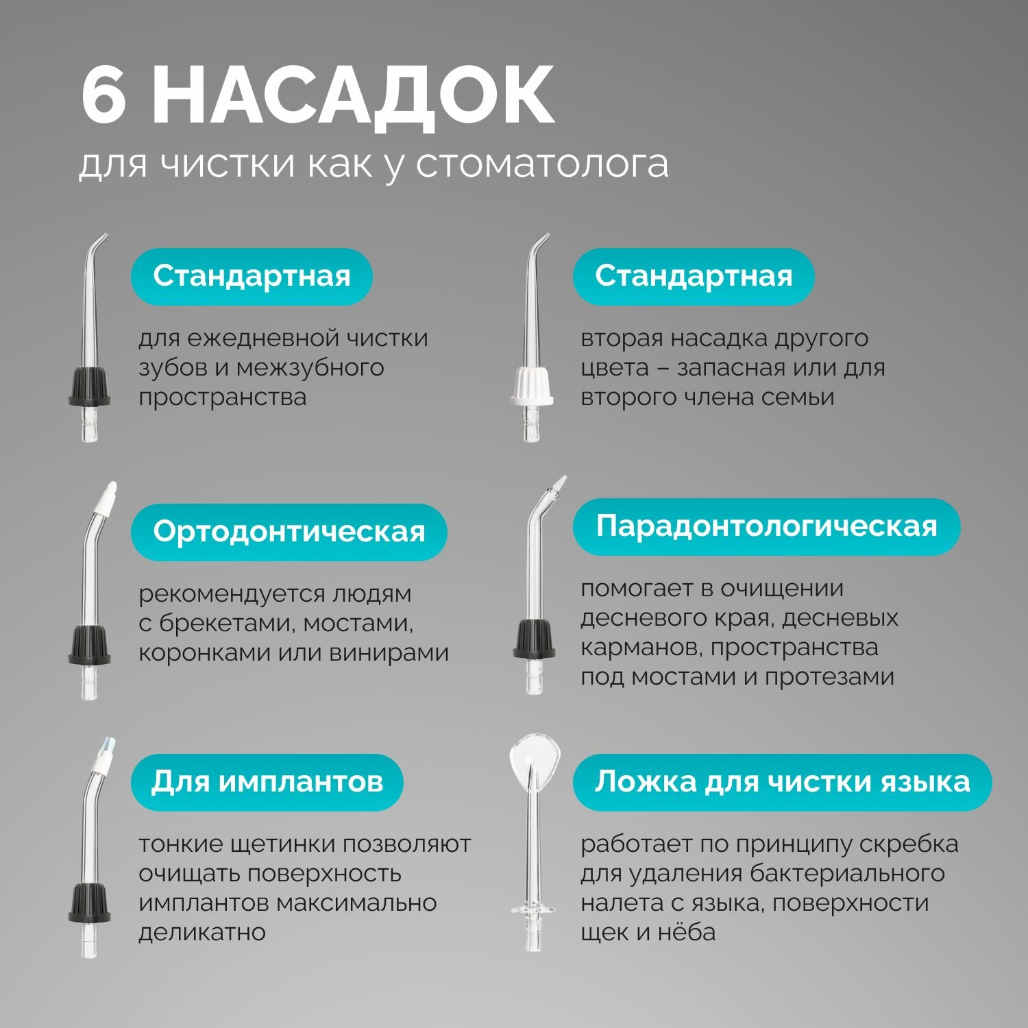 | Насадки | для струйной чистки / для чистки имплантов и коронок / для чистки языка / ортодонтическая (для брекетов) / пародонтологическая (для десен) |
