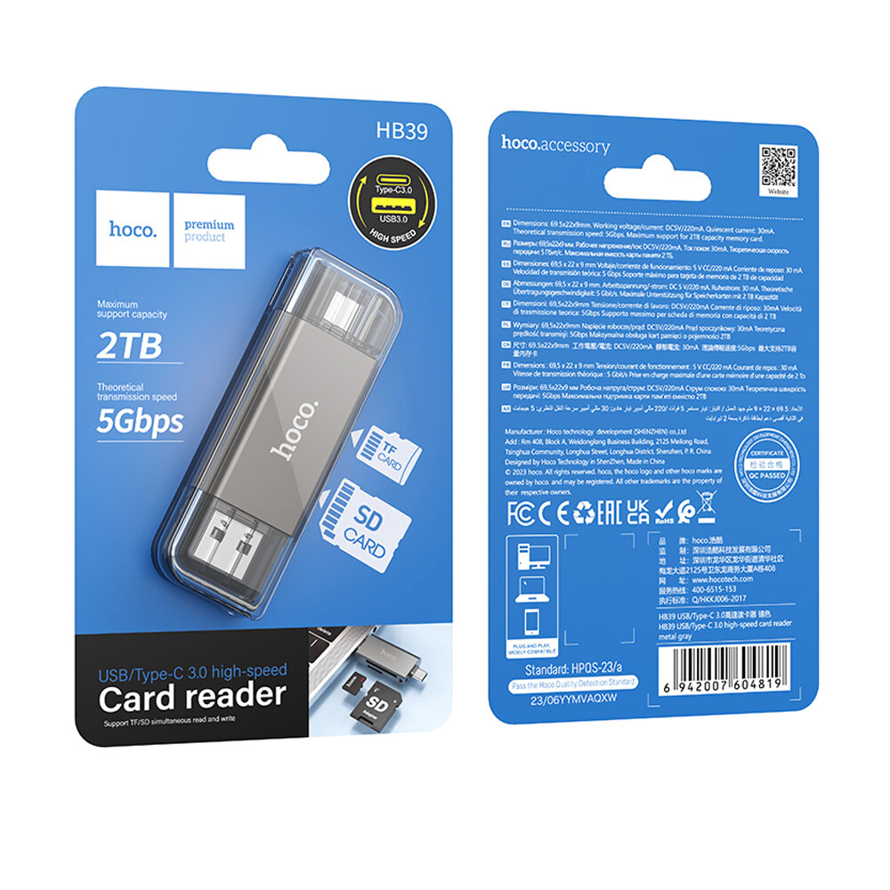 Высокоскоростной картридер Hoco HB39 USB / Type-C 3.0 для SD и MicroSD / TF карт, серый информация: