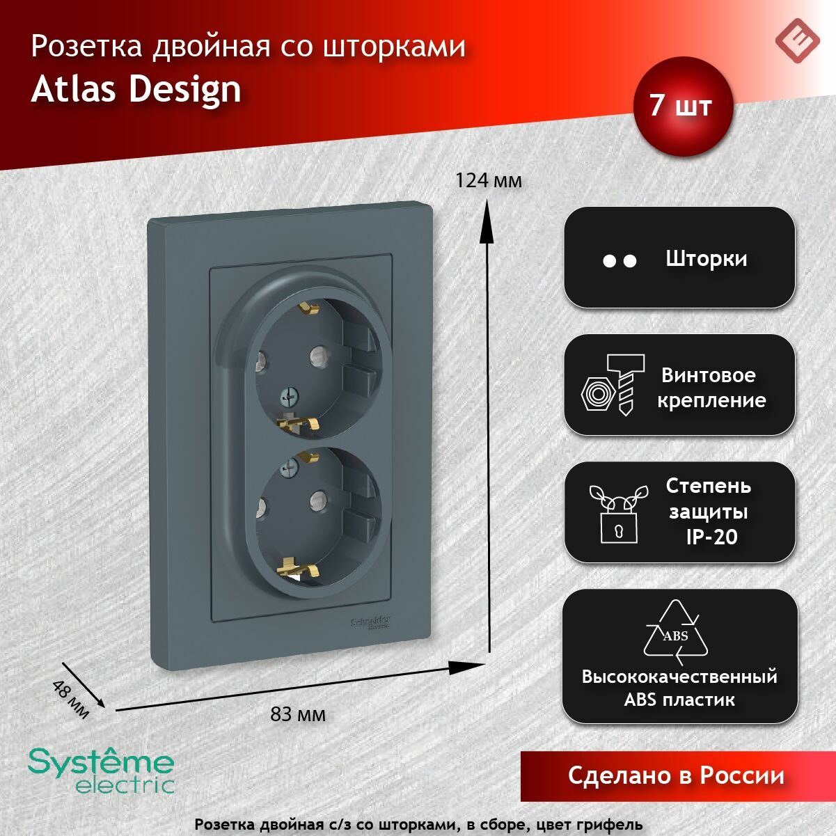 Розетка двойная грифель, с заземлением, со шторками,16А, в сборе, Schneider Electric AtlasDesign (комплект 7шт) информация: