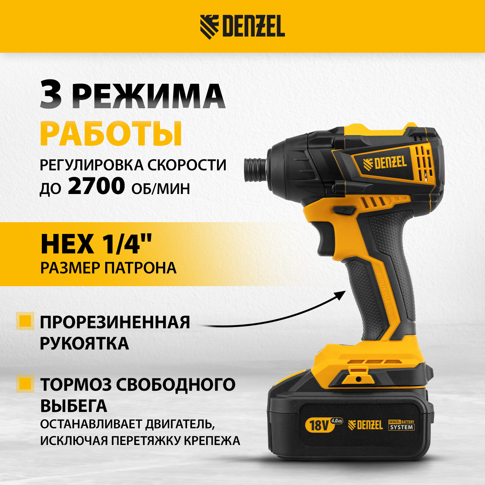 10 цен на Винтоверт ударный аккумуляторный бесщет Denzel CID-IB-200 18В Li-Ion,26510