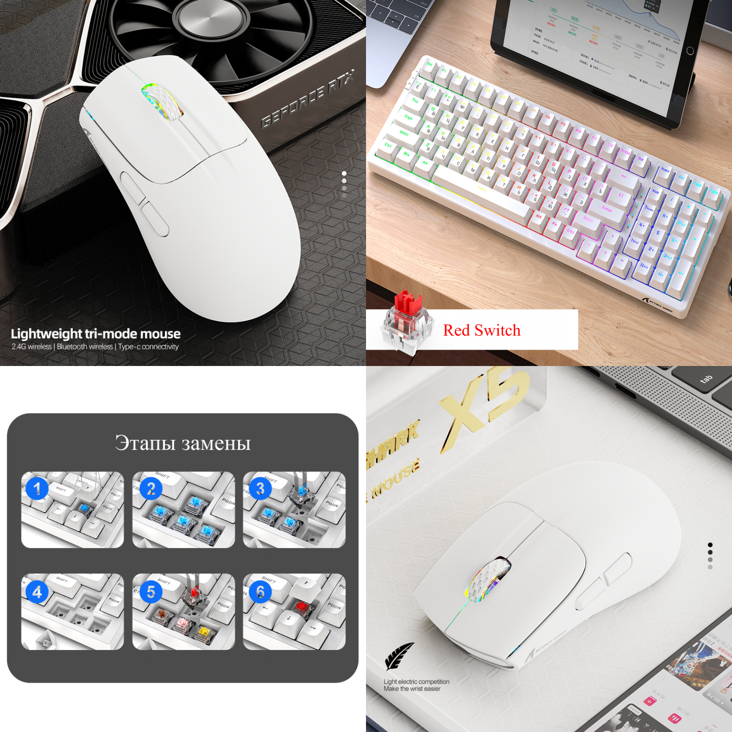 Комплект мышь клавиатура беспроводная механическая русская Attack Shark К98 Hot-Swap мышка Х5 Bluetooth+2.4Ghz + проводная с подсветкой набор информация: