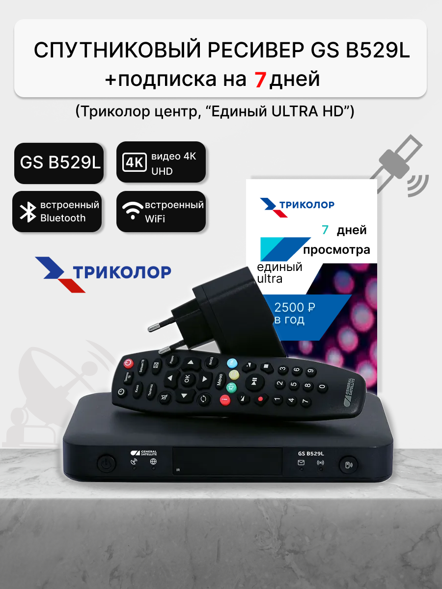 | Комплектация | Двухтюнерный приёмник-сервер GS B529L/B627/B626L; Пульт дистанционного управления; Адаптер электропитания; Элементы питания для пульта (2 шт.); Подписка Триколор на 7 дней просмотра пакета "Единый ULTRA". |