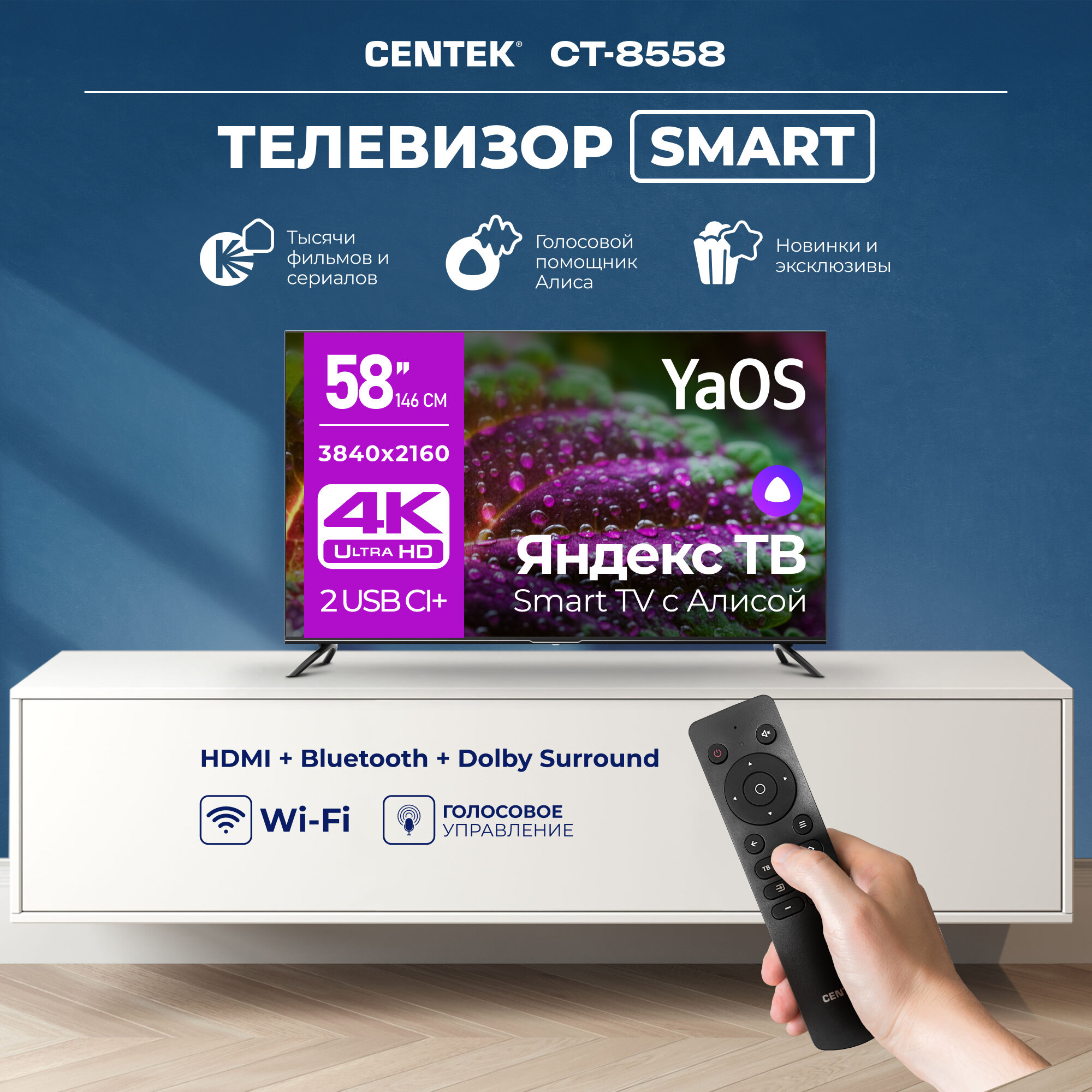 Телевизор Centek CT-8558 SMART/ 58 дюймов с поддержкой 4К Ultra HD, Wi-Fi, Bluetooth, Яндекс YaOS, Алиса информация: