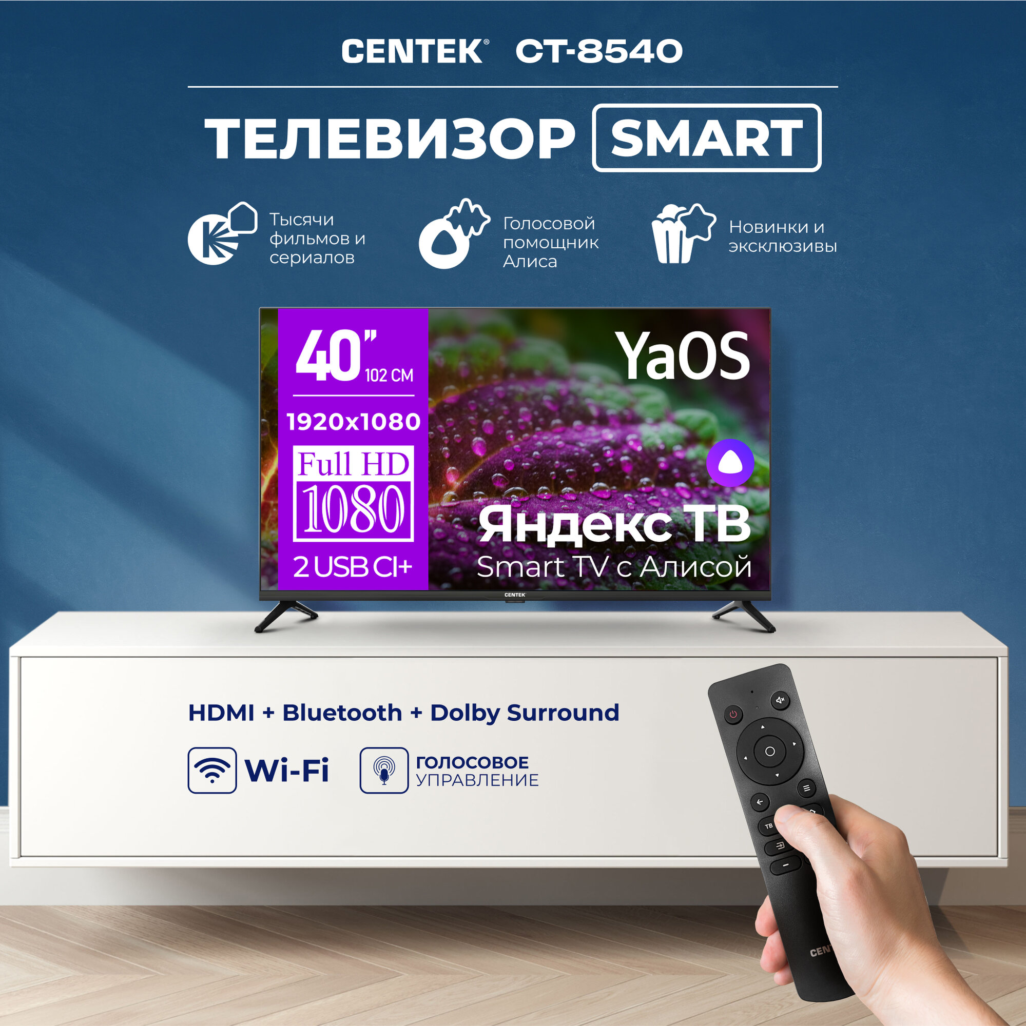 Телевизор Centek CT-8740 SMART, 40 дюймов, FullHD, Wi-Fi, Bluetooth, HDMIx3, USBx2, DVB-T/T2, Яндекс YaOS, Алиса информация: