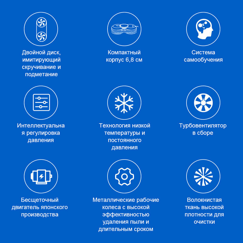 | Особенности | автоматическая остановка / автоматическое определение зоны уборки / звуковая индикация / мойка безрамных поверхностей / обход препятствий / светодиодная индикация |
