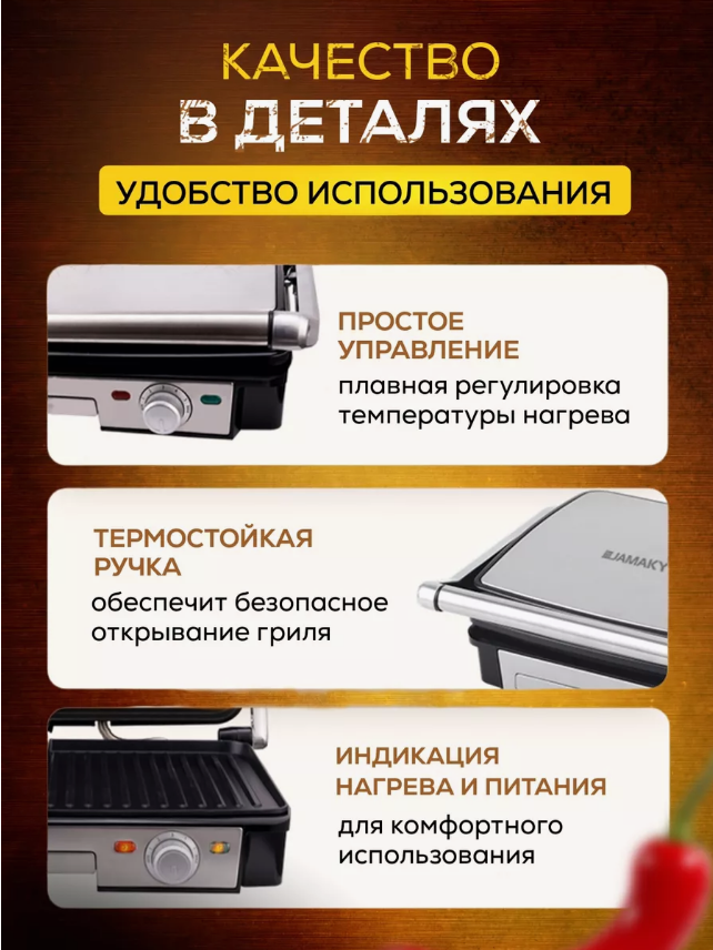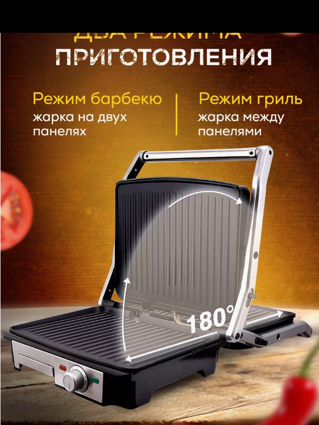 | Дополнительная информация | оды и панини. Усиленное антипригарное покрытие пластин защищает ингредиенты от пригорания и очень легко моется. Готовьте разнообразные блюда с многофункциональным электро грилем: стейки, рыба, овощи, панини, шаурма и многое другое. После приготовления удобный лоток для сока и жира легко снимается и его можно мыть как в ручную, так и в посудомоечной машине. Порадуйте себя и своих близких невероятно вкусными блюдами всего за считанные минут вместе с электрогрилем. Электрогриль и барбекю 2в1 будет оригинальным подарком маме, папе, бабушке, дедушке, брату, сестре на новый год, день рождения, 8 марта, 23 февраля |