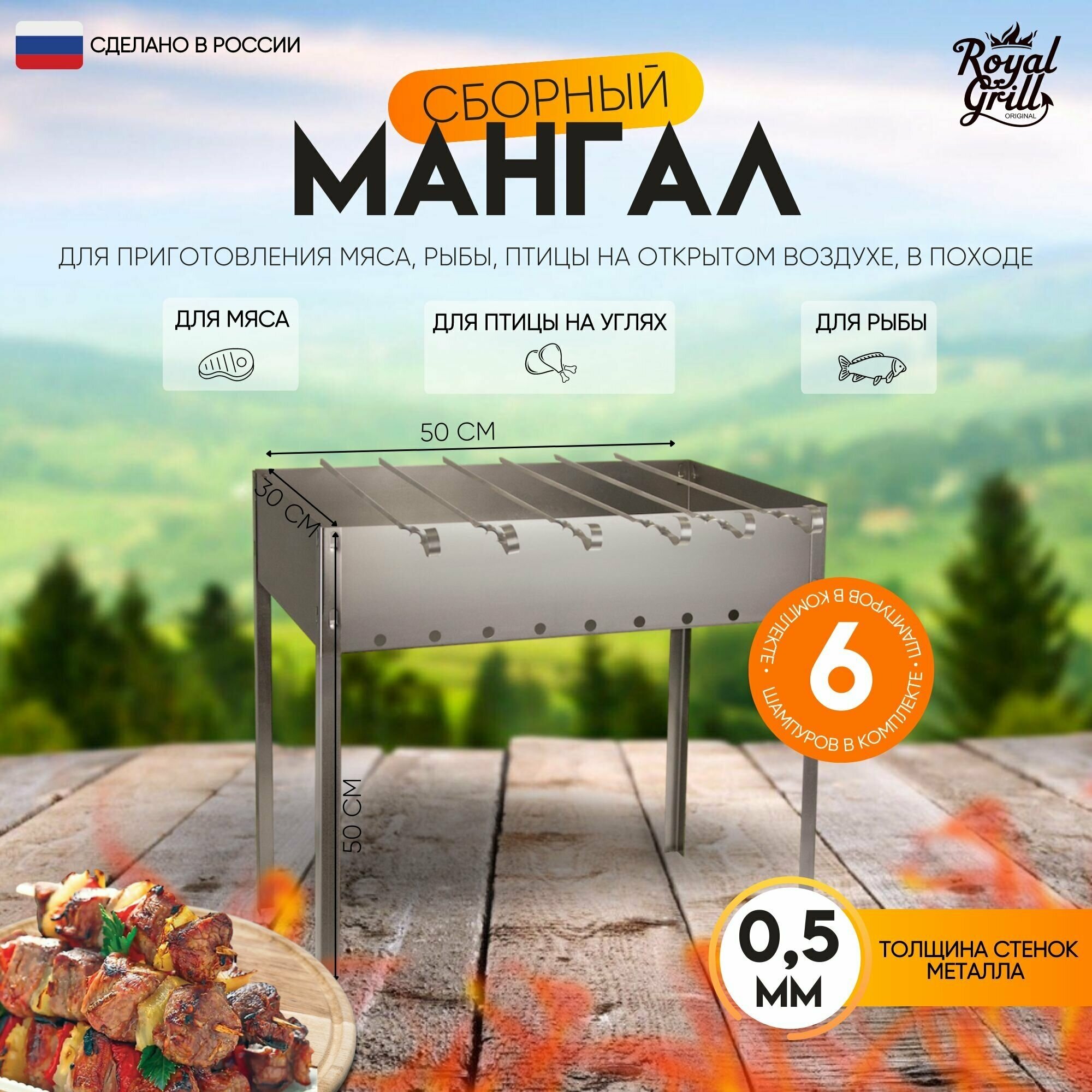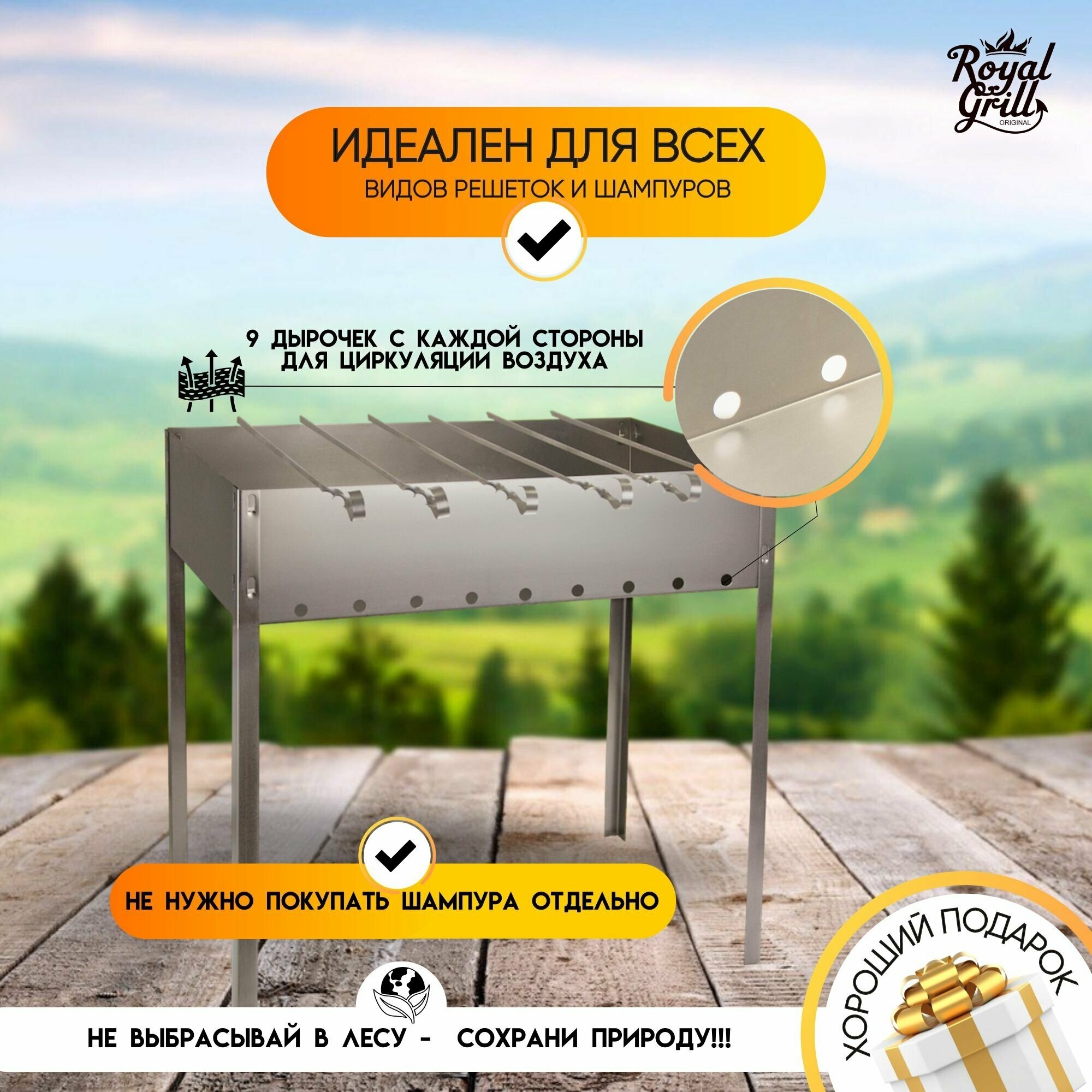 10 цен на Мангал сборный Royalgrill 50х30см (05мм) +6шампуров в коробке 80-046 .