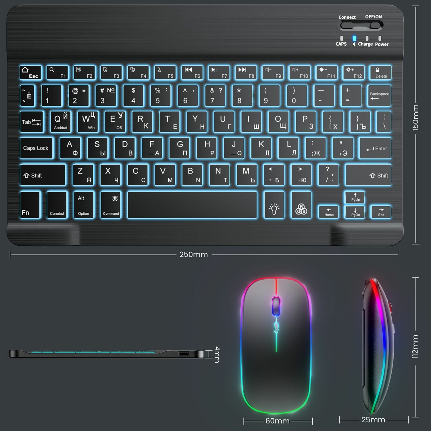 Беспроводная клавиатура и мышь с rgb подсветкой для телефона и планшета с bluetooth для Android/IOS/Windows черная информация: