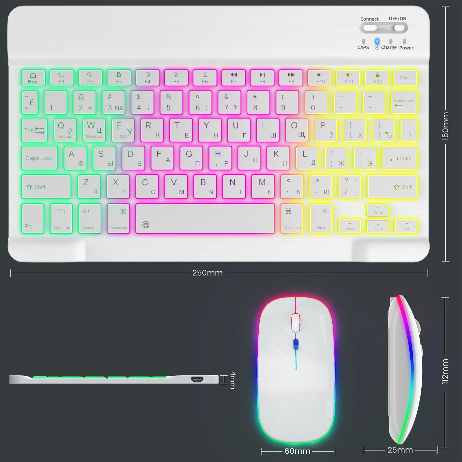 Беспроводная клавиатура и мышь с rgb подсветкой для телефона и планшета с bluetooth для Android/IOS/Windows белая информация: