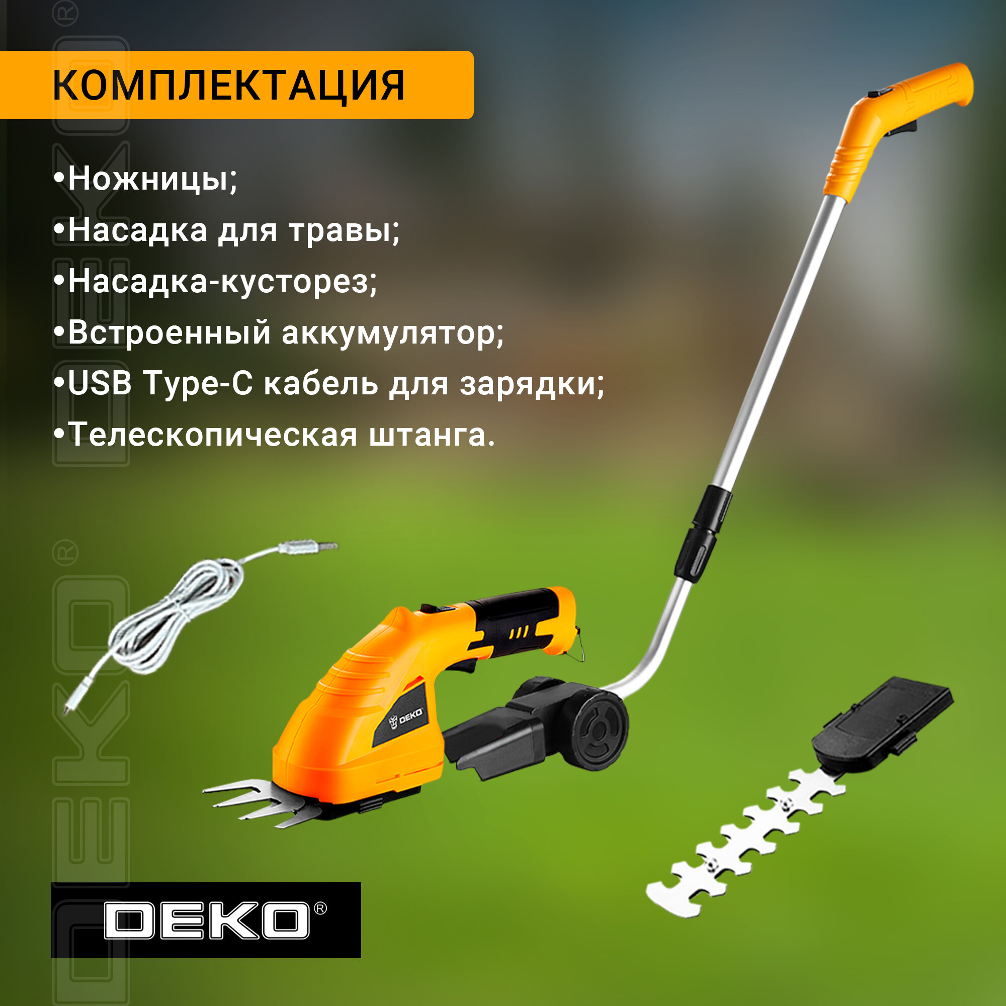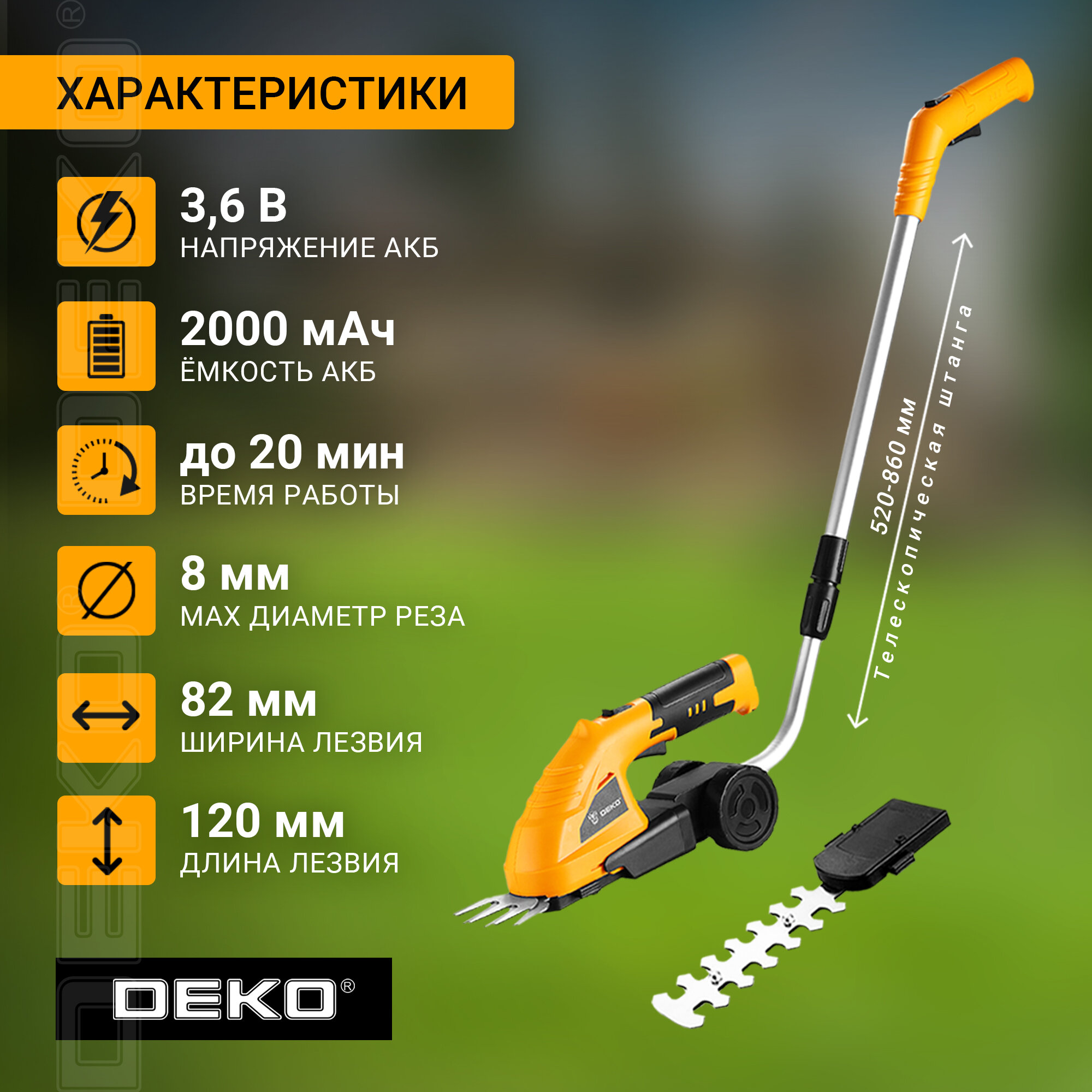 Ножницы-кусторез аккумуляторные DEKO DKGS3.6, 3.6 В, 2 Ач, Li-ion, поворотная рукоятка
