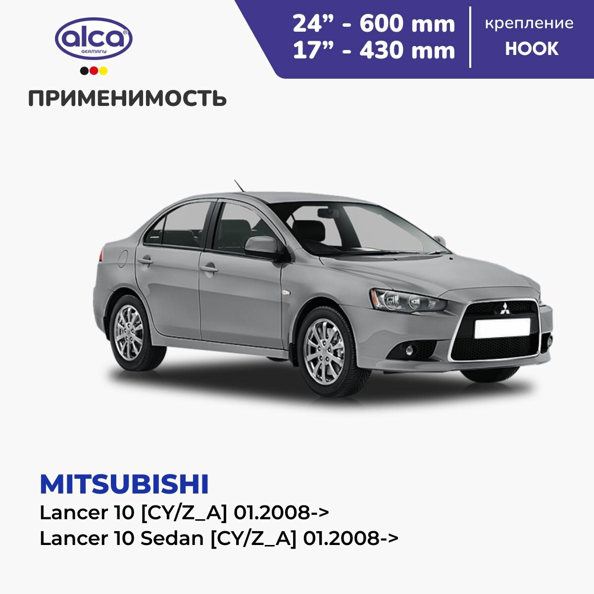 Дворники бескаркасные ALCA (Германия) для Mitsubishi Lancer 10 600/430 мм крепление крючок 9x3 информация: