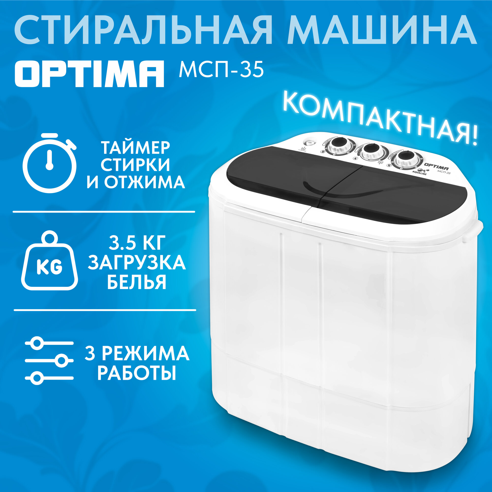 Стиральная машина Optima МСП-35, активаторная, загрузка до 3.5 кг, 3 программы, таймер стирки,белый/чёрный информация: