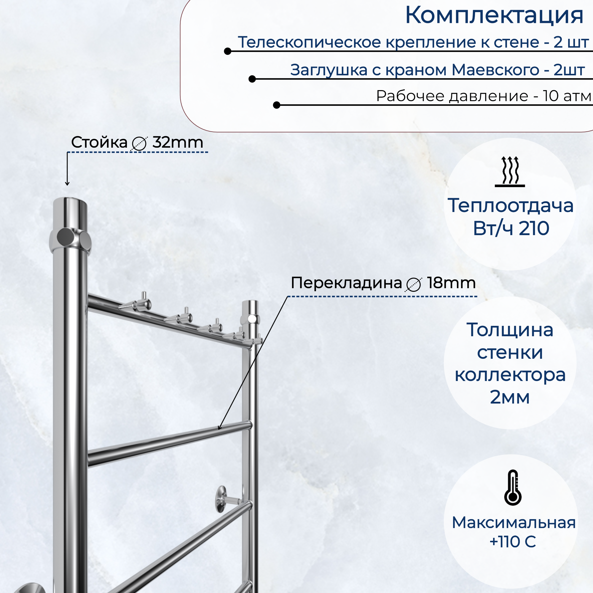 Водяной полотенцесушитель «юрма» H1 80/50см нержавеющая сталь с крючками для полотенец информация: