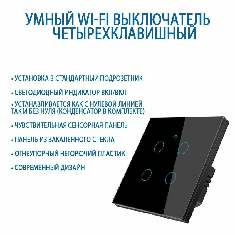 Умный выключатель с Алисой, сенсорный выключатель с Wi-Fi четырехклавишный черный, подключение с нулем и без нуля, закаленное стекло информация: