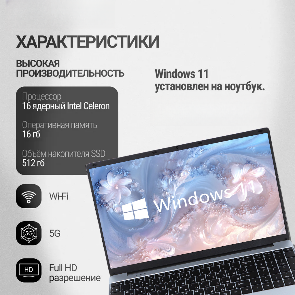 Ноутбук Wixg 15,6 дюйма, Intel Celeron, RAM 16GB, SSD 256GB, Windows 11, IPS, Full HD 31 900 ₽
