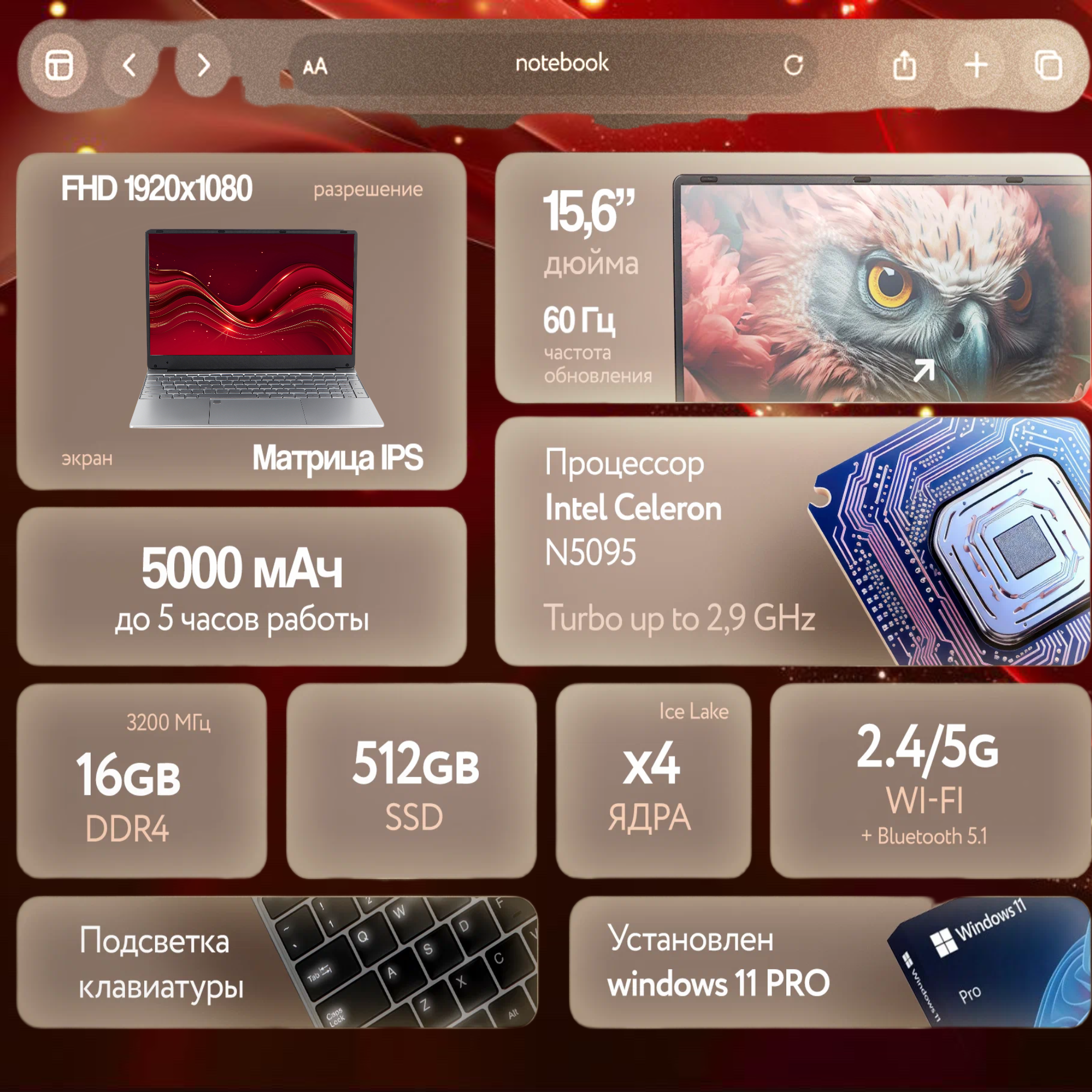 Ноутбук 15.6", Intel Celeron N5095 (2.9 ГГц), RAM 16 ГБ, SSD 512ГБ, Intel UHD Graphics, Windows 11 Тёмно - серый Русская раскладка IPS Full HD 1920x1080 33 198 ₽