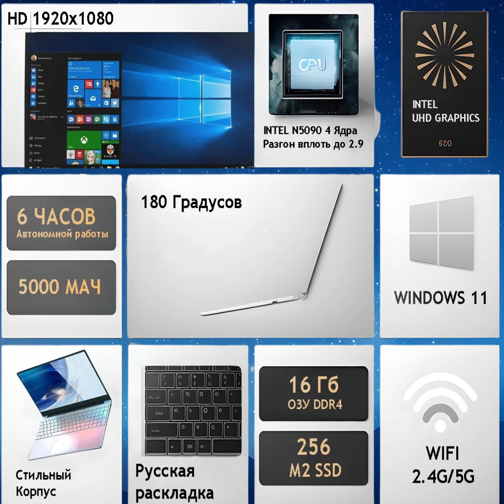 Ноутбук 15.6", Intel Celeron N5095 (2.9 ГГц), RAM 16 ГБ, SSD 256ГБ, Intel UHD Graphics, Windows 11 ,Светло - серый ,Русская раскладка IPS Full HD 1920x1080 информация: