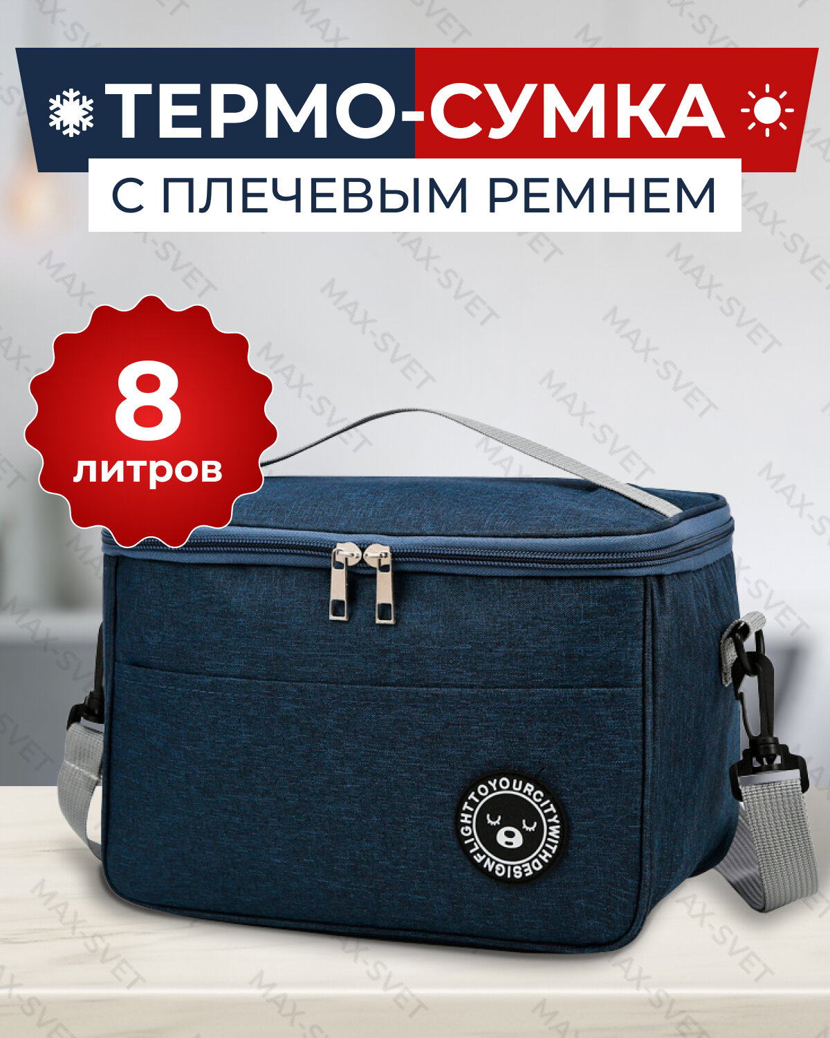 Сумка холодильник S-MAX объемом 8 литров со съемным плечевым ремнем, водонепроницаемыми швами для сохранения продуктов в тепле или холоде, синяя информация: