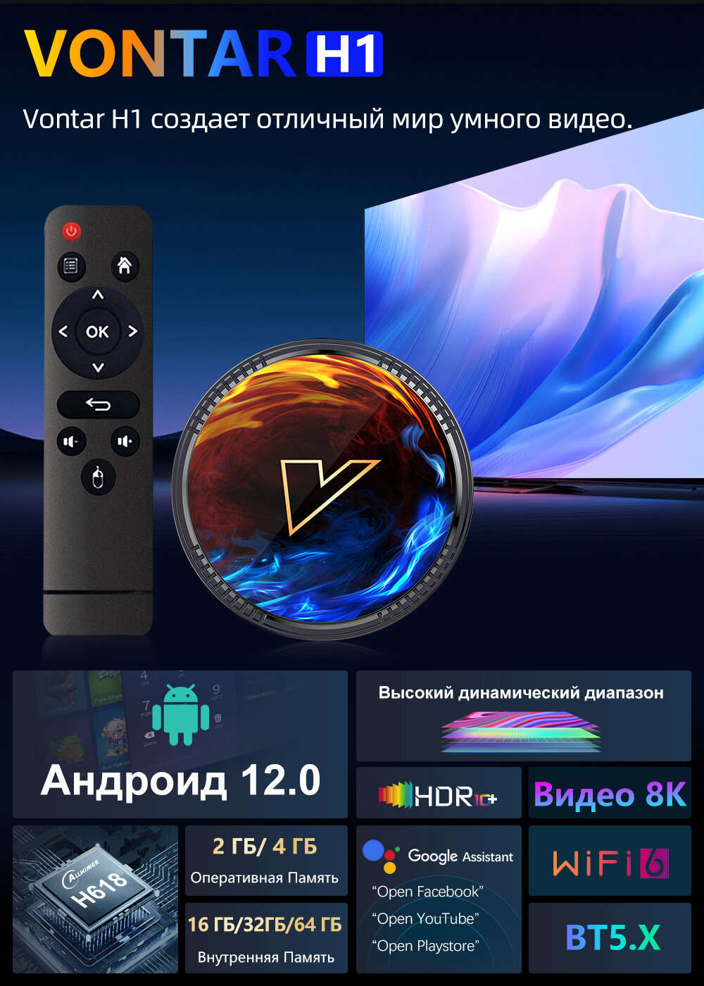 Отзывы на Смарт ТВ приставка VONTAR H1 Allwinner H618 Android 12 Поддержка 8K Видео BT5.0 Wifi 6 4/64ГБ Медиаплеер Google Voice