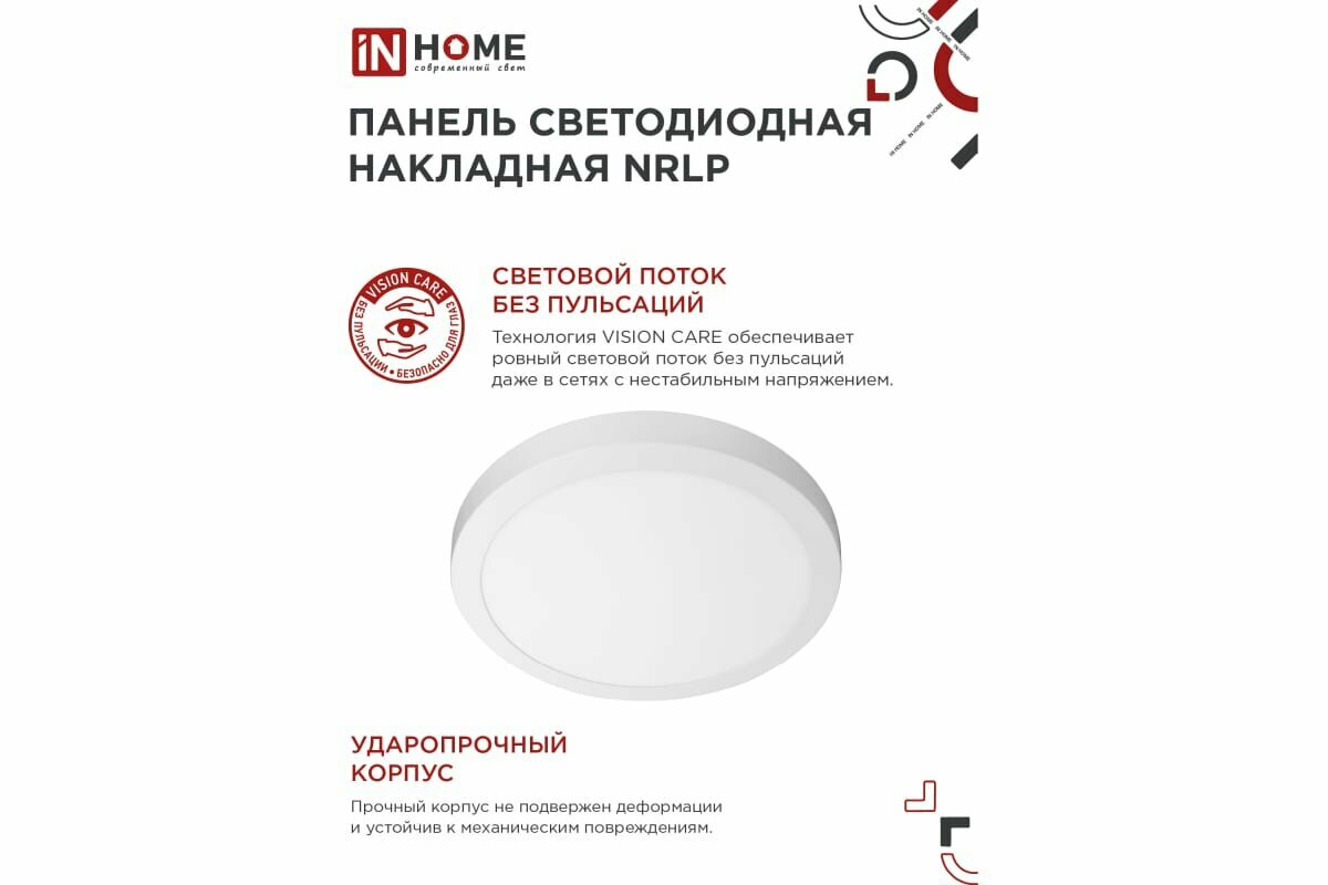 Отзывы на IN HOME Светильник светодиодный круглый накладной NRLP 24Вт 230В 4000К 1680лм 285мм IP40 бел. панель 4690612038537