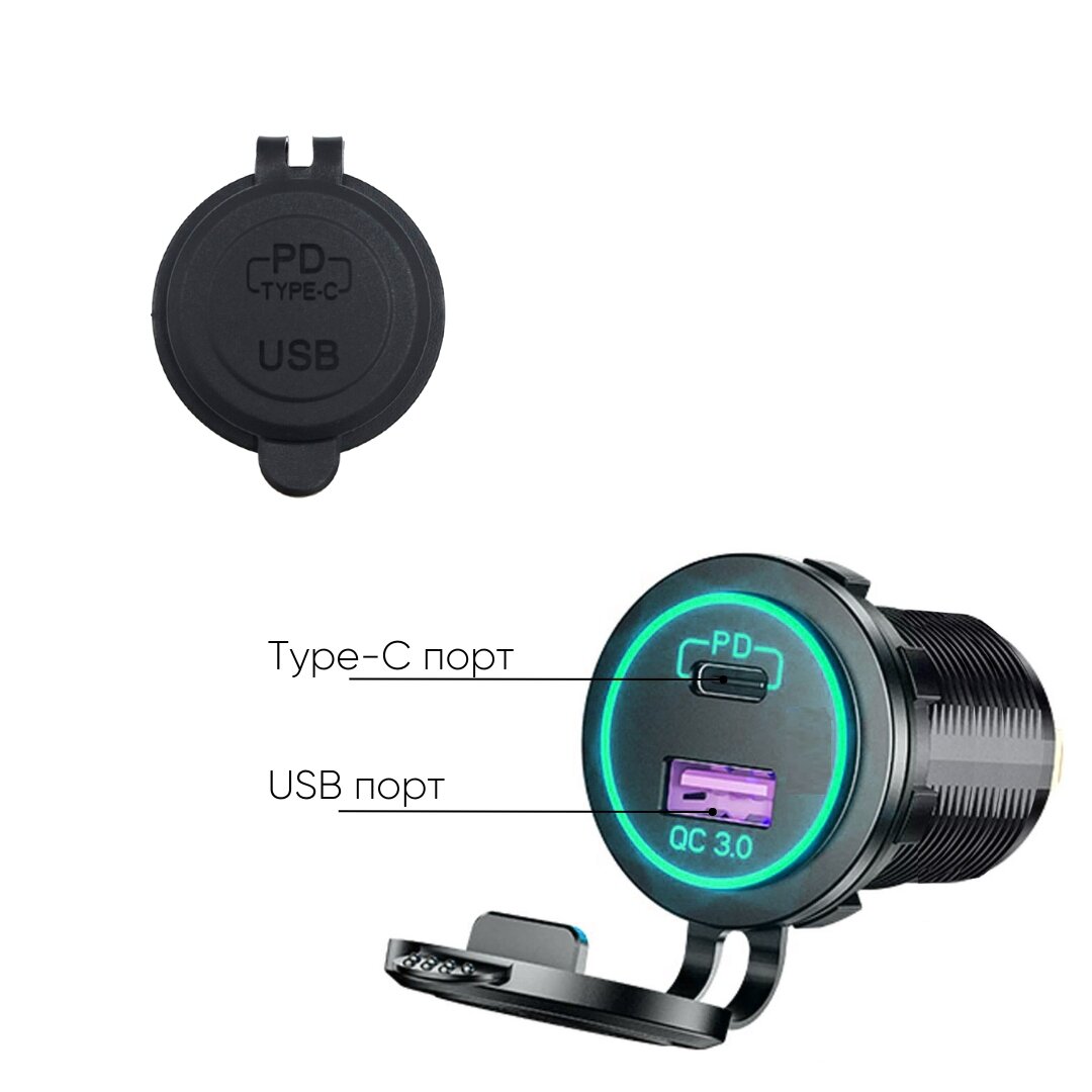 10 цен на Розетка 12V / 24V USB + Type-C быстрая зарядка, влагозащитная, 2 выхода QC 3.0, PD, круглая, подсветка зеленая
