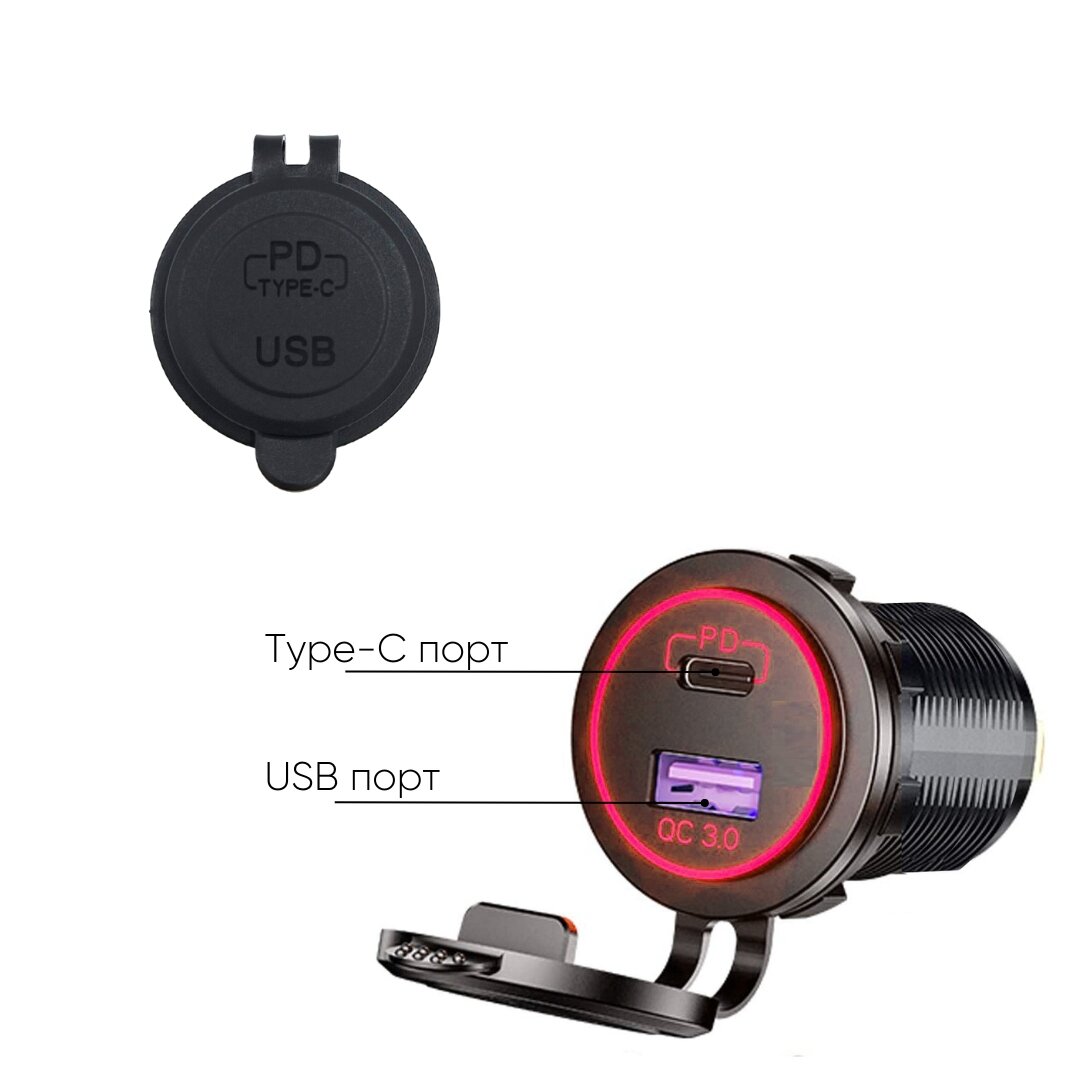 Отзывы на Розетка 12V / 24V USB + Type-C быстрая зарядка, влагозащитная, 2 выхода QC 3.0, PD, круглая, подсветка красная