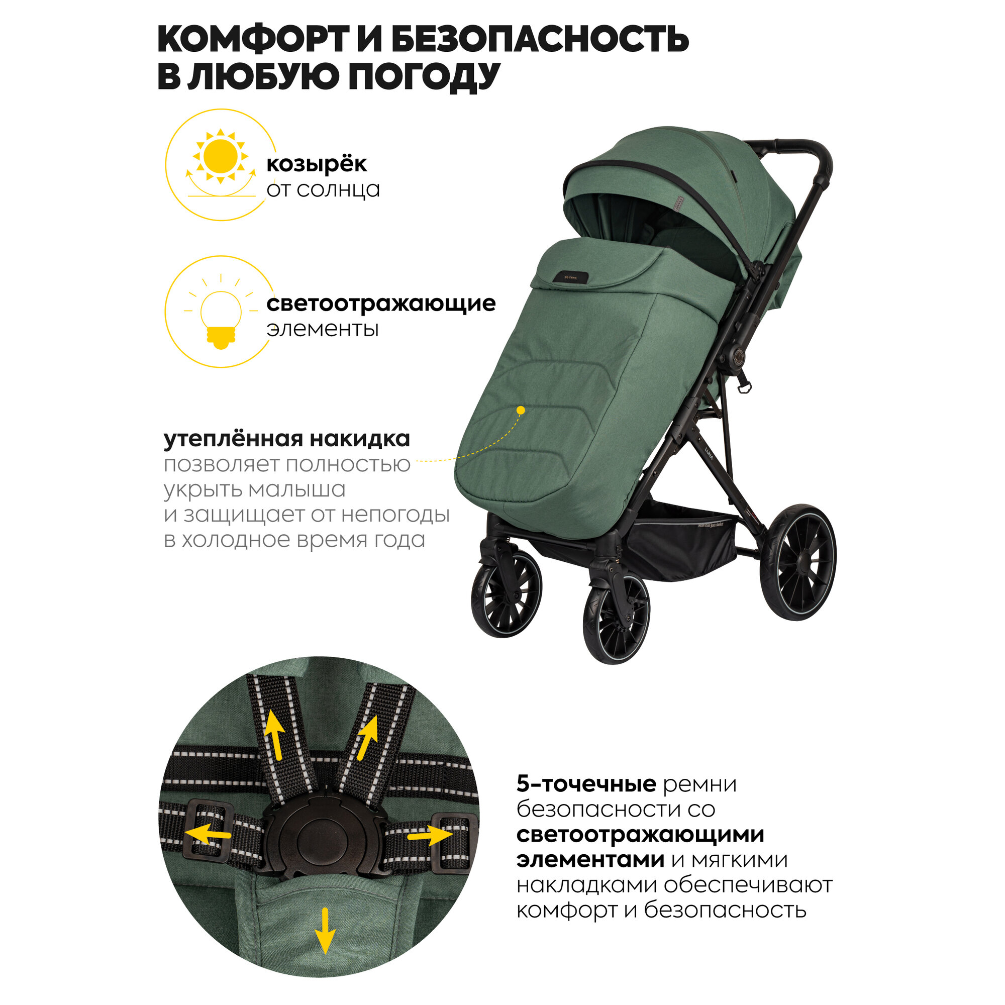 | Аксессуары в комплекте | антимоскитная сетка, бампер, капюшон, накидка на ноги, солнцезащитный козырек |