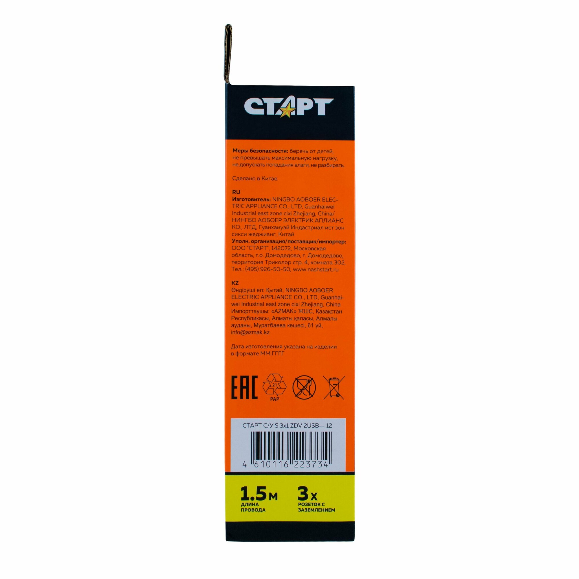 Старт 4607175852678 Удлинитель 3 розетки. С У S 3x1. Длина провода 1,5 м. Без заземления.