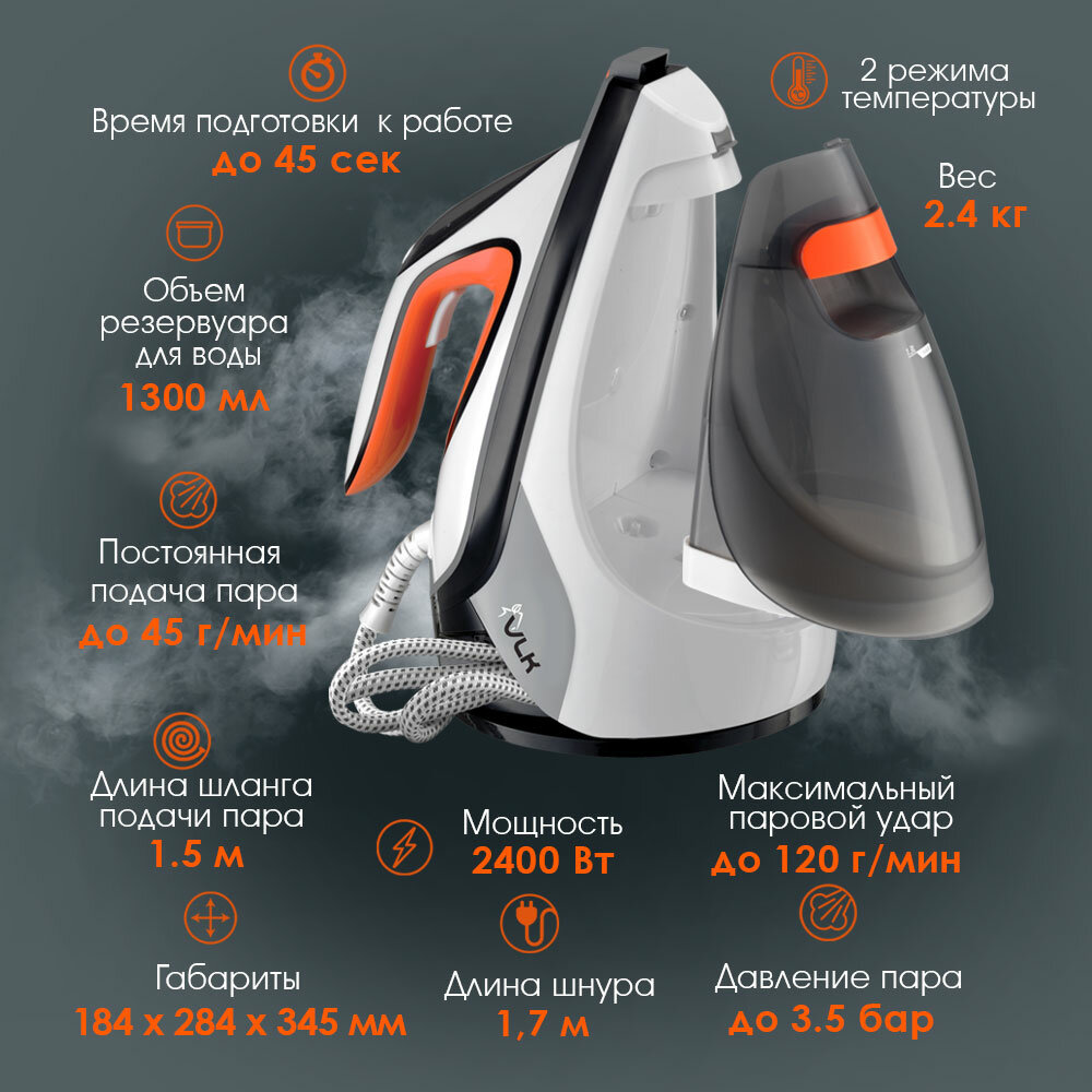Утюг с парогенератором для одежды VLK Vesuvio-5500 паровой удар до 120 г/мин / сухая глажка / вертикальное отпаривание / автоотключение / анти-накипь информация: