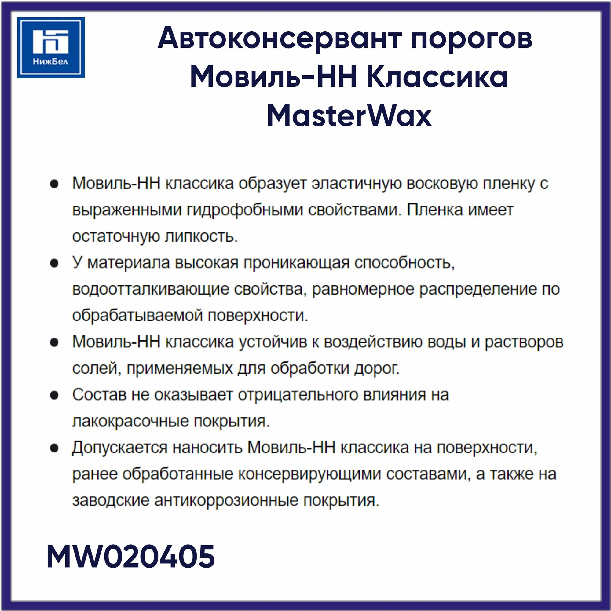 Автоконсервант порогов Мовиль-НН MasterWax MW020405 канистра 1л информация: